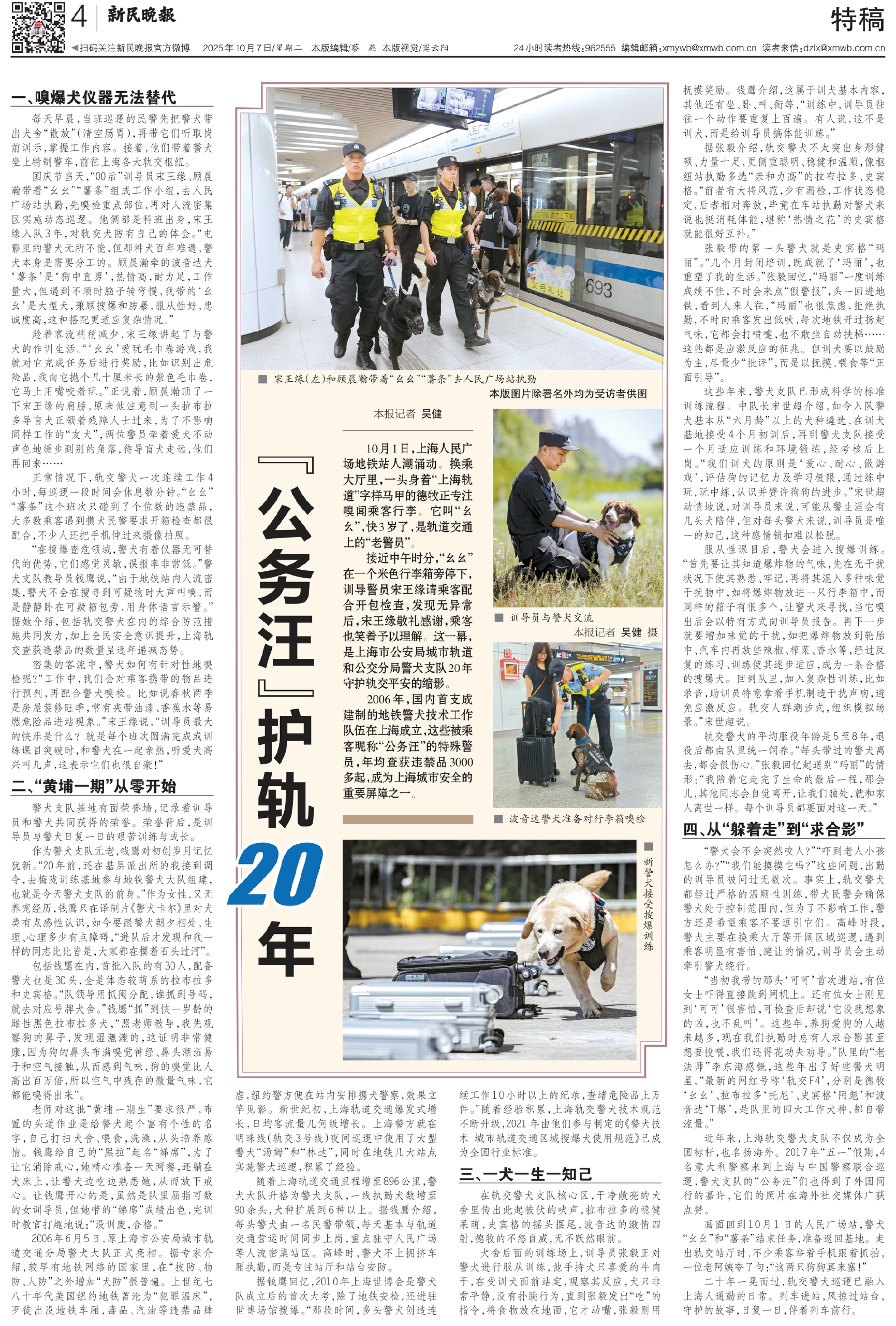 “当初我带的那头‘可可’首次进站,有位女士吓得直接跳到闸机上。还有位女士刚见到‘可可’很害怕,可检查后却说‘它没我想象的凶,也不乱叫’。这些年,养狗爱狗的人越来越多,现在我们执勤时总有人求合影甚至想要投喂,我们还得花功夫劝导。”队里的“老法师”李东海感慨,这些年出了好些警犬明星,“最新的网红号称‘轨交F4’,分别是德牧‘幺幺’、拉布拉多‘托尼’、史宾格‘阿彪’和波音达‘T爆’,是队里的四大工作犬种,都自带流量。”