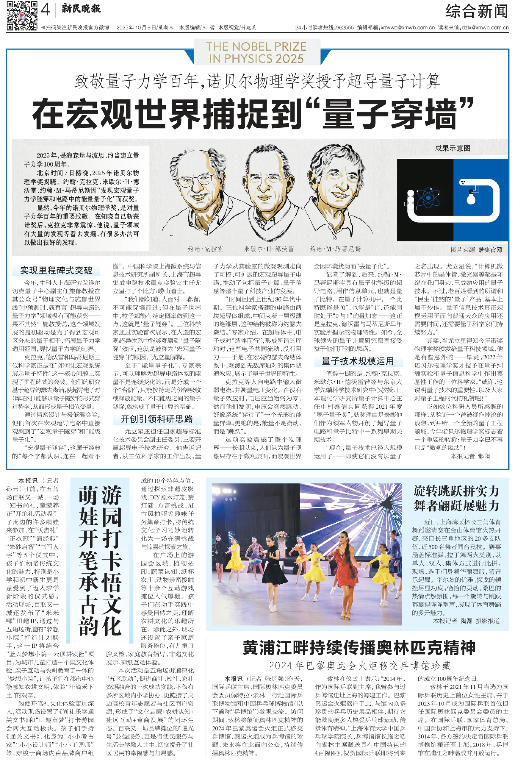 尤立星还担任国家超导标准化技术委员会副主任委员,主要开展超导电子技术研究。他告诉记者,从三位科学家的工作出发,量子力学从实验室的微观观测走向了可控、可扩展的宏观超导量子电路,推动了包括量子计算、量子传感等整个量子科技产业的发展。