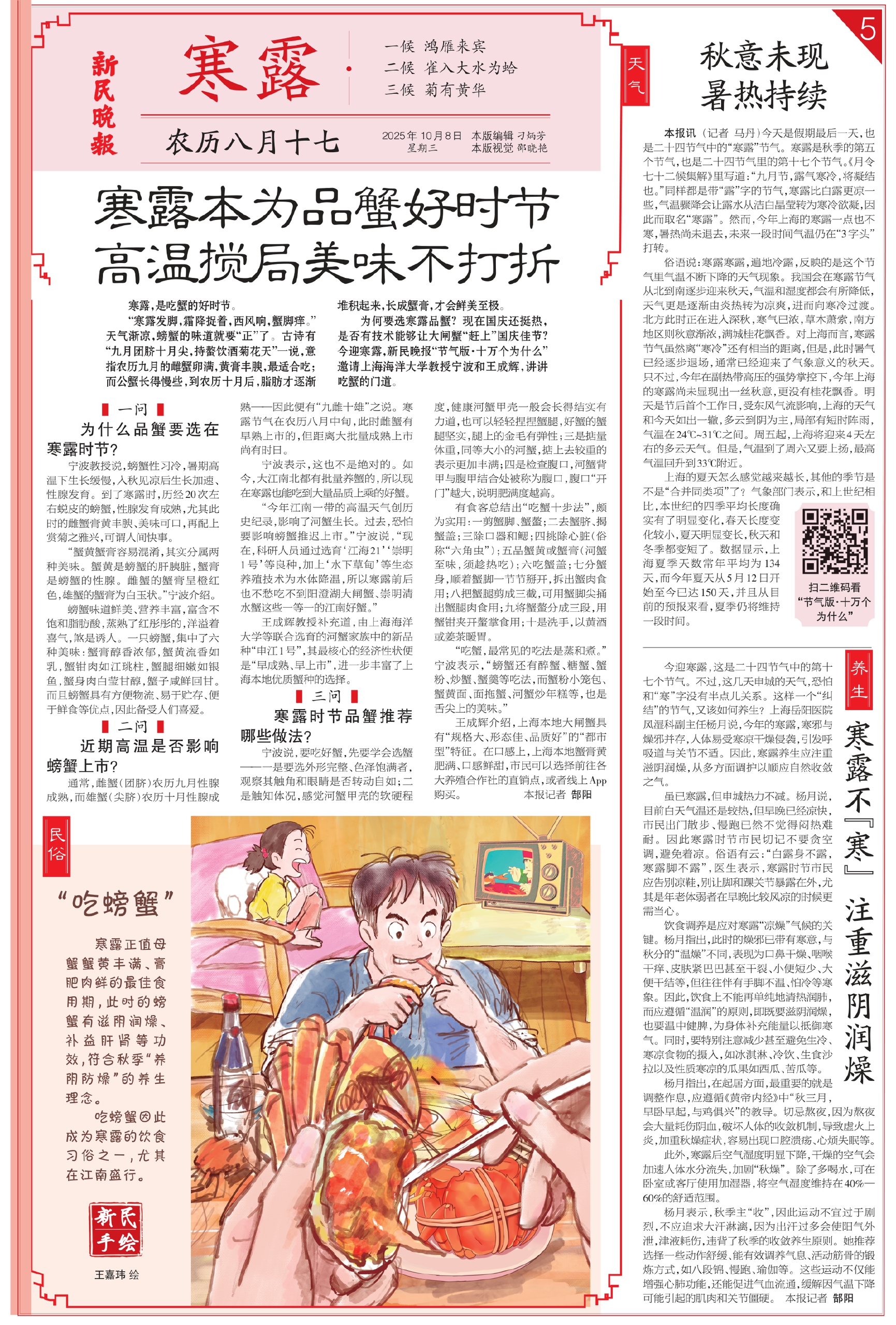 为何要选寒露品蟹?现在国庆还挺热,是否有技术能够让大闸蟹“赶上”国庆佳节?今迎寒露,新民晚报“节气版·十万个为什么”邀请上海海洋大学教授宁波和王成辉,讲讲吃蟹的门道。