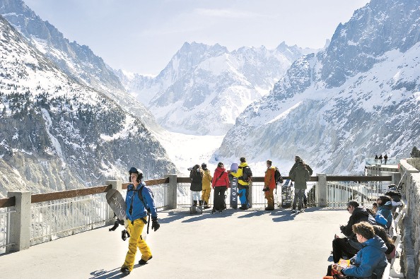 游客在观景台观赏法国冰海冰川