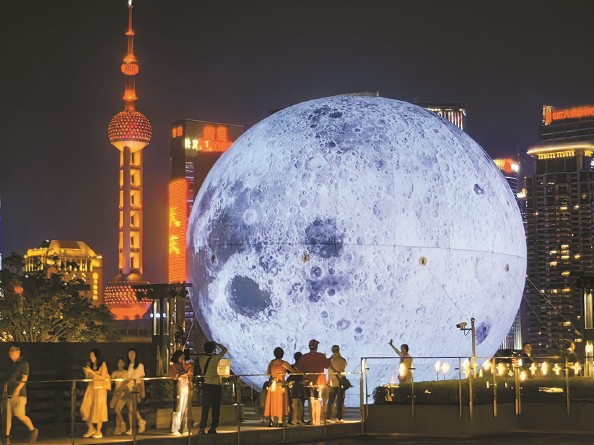 外滩成为长假里游客最集中的热闹景点。BFC外滩金融中心露台的大月亮艺术装置吸引游客打卡拍照 杨建正 摄