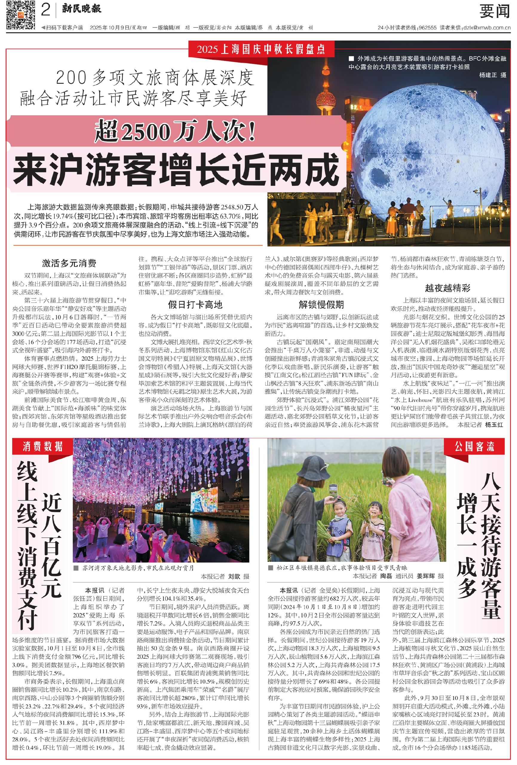 第三十六届上海旅游节贯穿假日,“中央公园音乐嘉年华”“静安好戏”等主题活动升级都市玩法,10月6日落幕时,“一节两季”近百日活动已带动全要素旅游消费超3000亿元;第二届上海国际光影节以1个主会场、16个分会场的177场活动,打造“沉浸式全视听盛宴”,吸引海内外游客打卡。