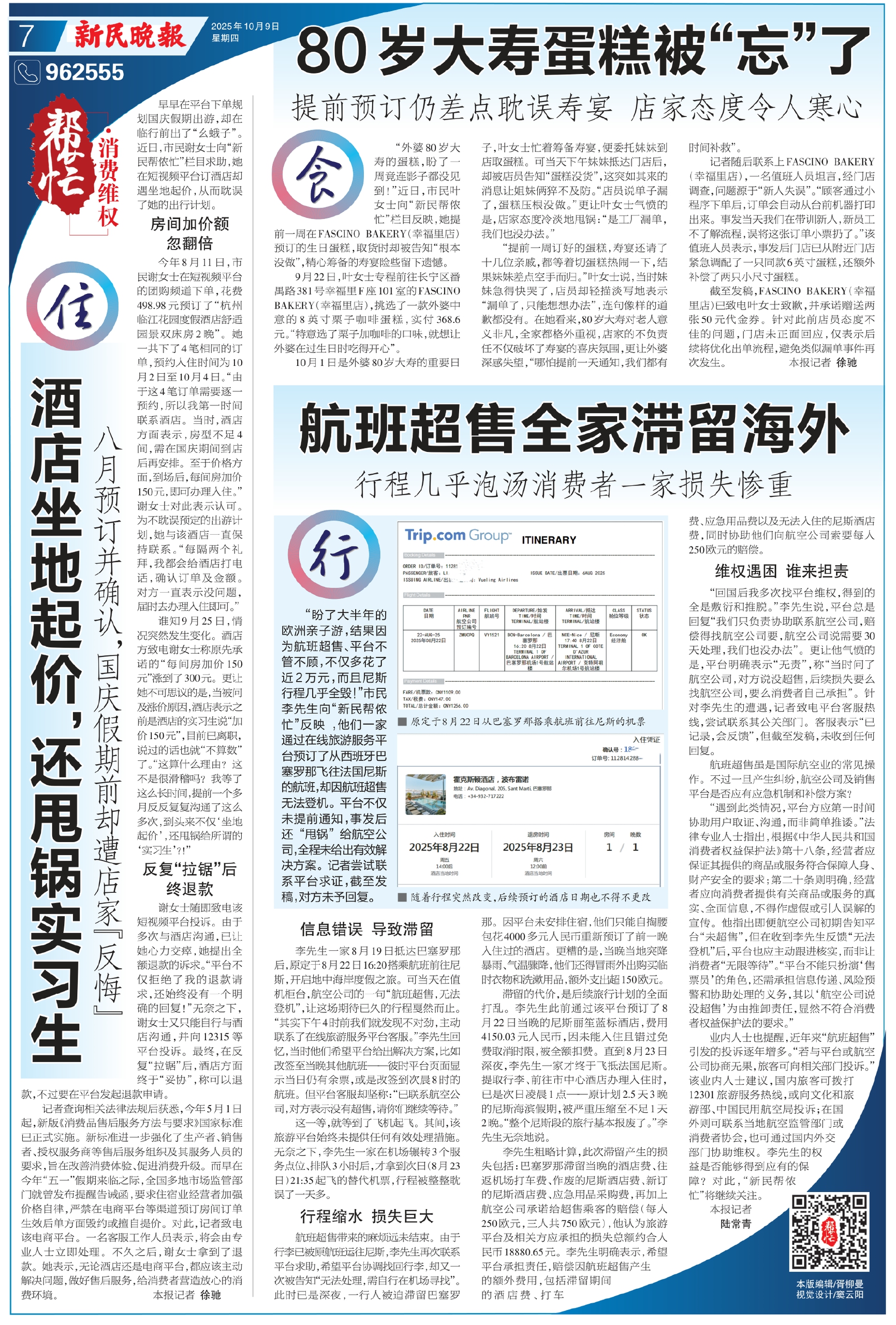 早早在平台下单规划国庆假期出游,却在临行前出了“幺蛾子”。近日,市民谢女士向“新民帮侬忙”栏目求助,她在短视频平台订酒店却遇坐地起价,从而耽误了她的出行计划。