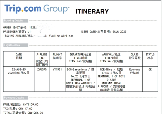 原定于8月22日从巴塞罗那搭乘航班前往尼斯的机票
