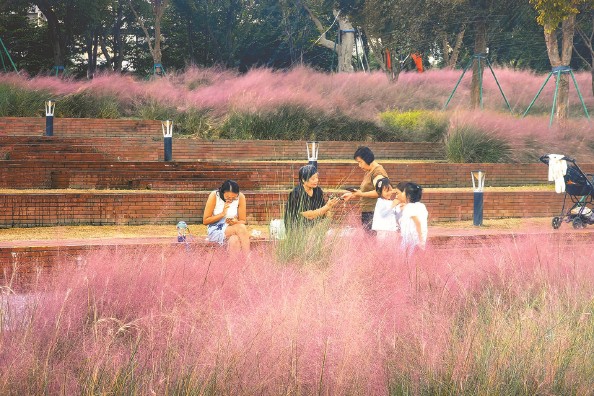 尽管申城这几天气温不低,但一些植物已显露初秋的色彩。在东岸滨江船厂1862的江畔绿地,这里种植的大面积粉黛乱子草已经呈现耀眼的粉红色,进入最佳观赏期。温柔的颜色点缀在绿地之间,带来了一份初秋浪漫的气息,吸引了不少市民游客前来打卡赏景。 杨建正 摄影报道