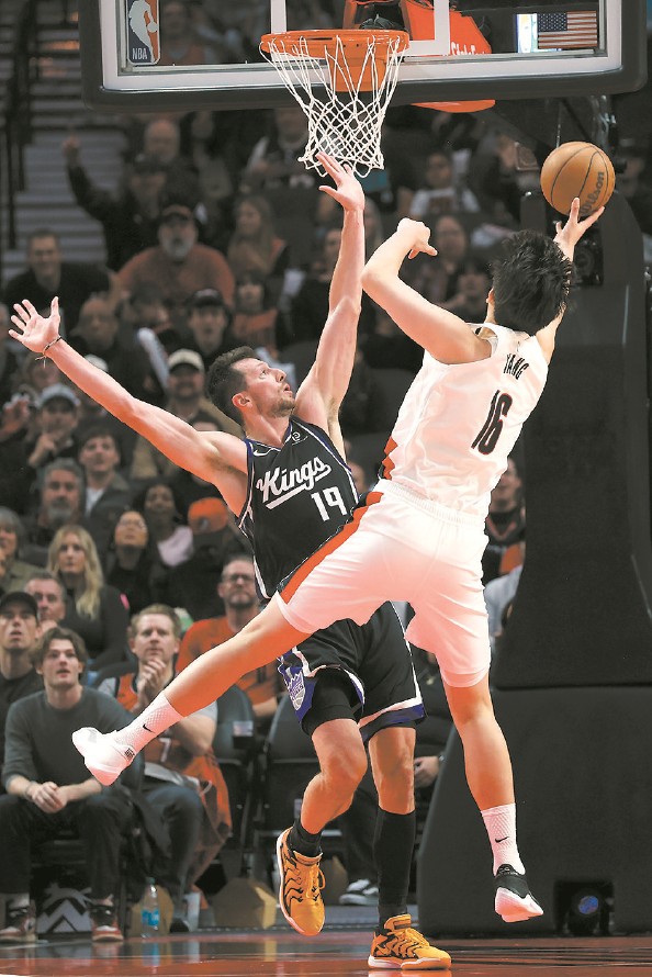 当比赛进行到开拓者75比69领先时,面对国王队的追分势头,杨瀚森在三分线外冷静出手,命中了第一个三分球。下一个进攻回合,他再次命中三分,瞬间点燃主场气氛。随后这位中国大个子接球上篮打板命中,在两分钟内连得8分。当国王队开始对他采取针对性防守时,他又展现出令人惊艳的篮下技术——背后运球过掉对手转身上篮再中,个人连得10分。