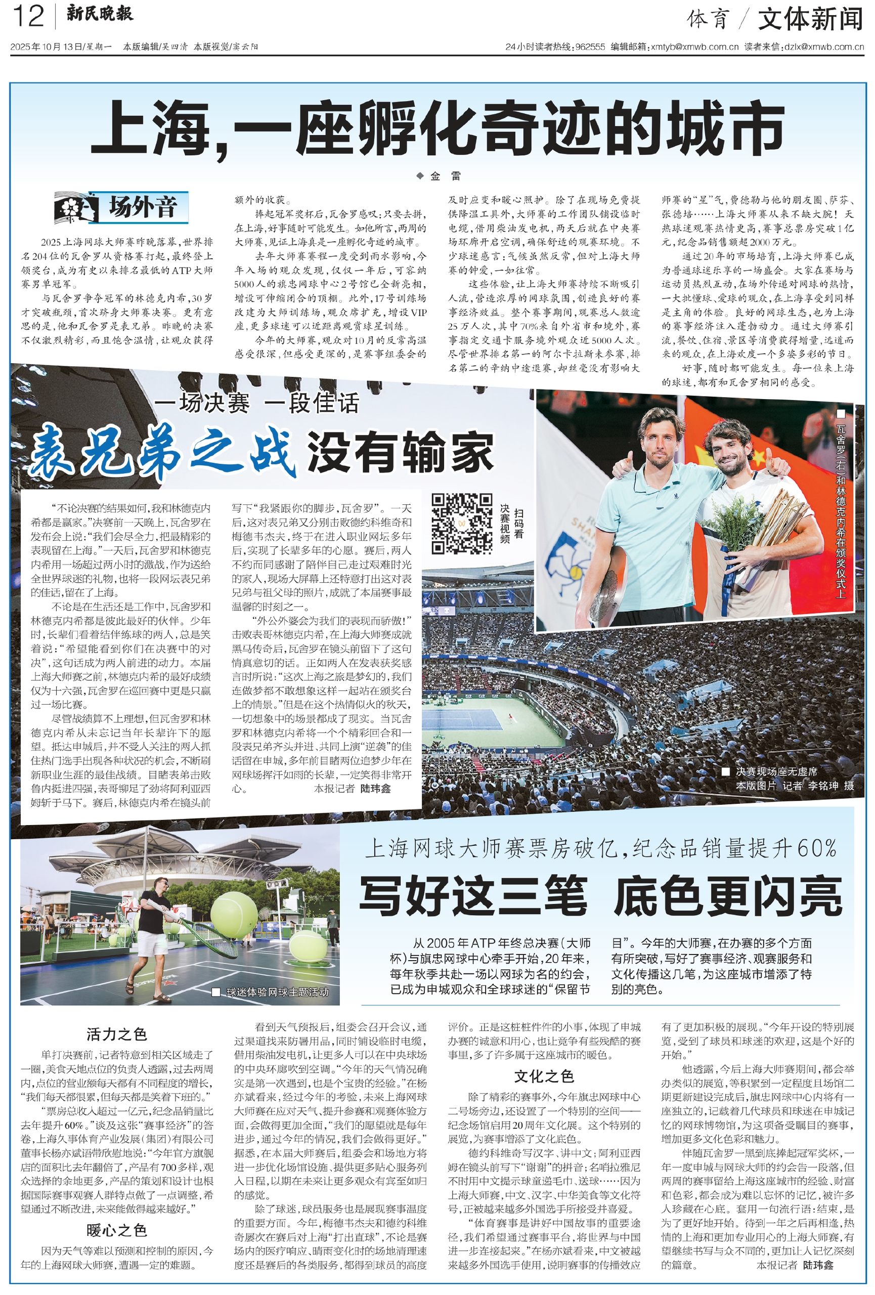 这些体验,让上海大师赛持续不断吸引人流,营造浓厚的网球氛围,创造良好的赛事经济效益。整个赛事期间,观赛总人数逾25万人次,其中70%来自外省市和境外,赛事指定交通卡服务境外观众近5000人次。尽管世界排名第一的阿尔卡拉斯未参赛,排名第二的辛纳中途退赛,却丝毫没有影响大师赛的“星”气,费德勒与他的朋友圈、萨芬、张德培……上海大师赛从来不缺大腕!天热球迷观赛热情更高,赛事总票房突破1亿元,纪念品销售额超2000万元。