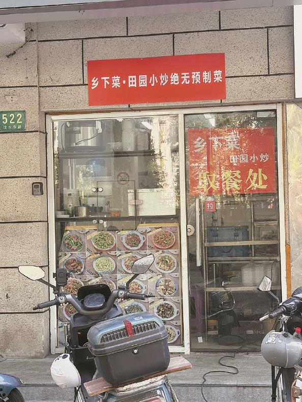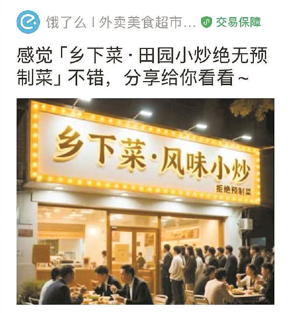 “乡下菜·田园小炒绝无预制菜”店的平台门头图与实际店面对比