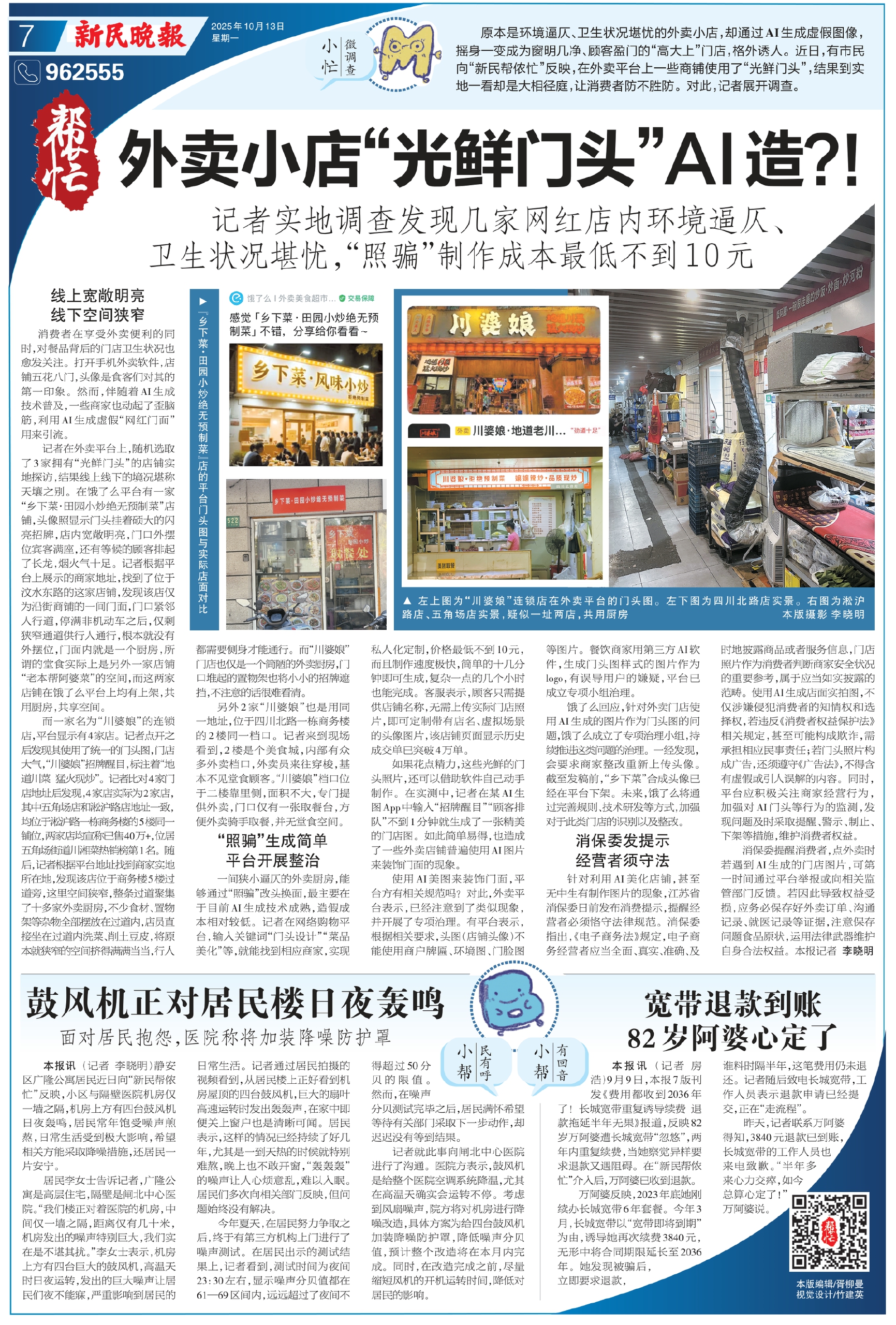 原本是环境逼仄、卫生状况堪忧的外卖小店,却通过AI生成虚假图像,摇身一变成为窗明几净、顾客盈门的“高大上”门店,格外诱人。近日,有市民向“新民帮侬忙”反映,在外卖平台上一些商铺使用了“光鲜门头”,结果到实地一看却是大相径庭,让消费者防不胜防。对此,记者展开调查。