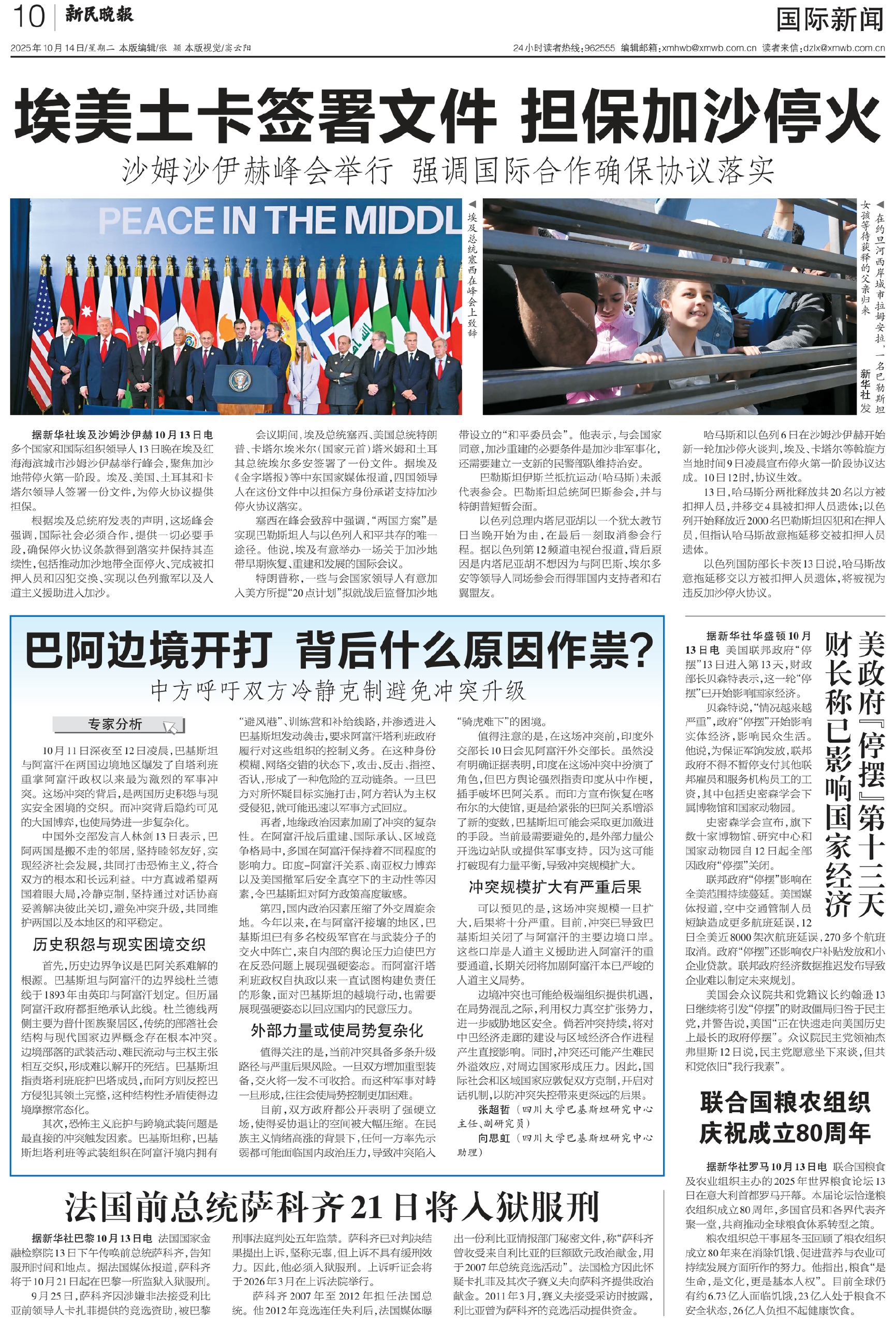 据新华社埃及沙姆沙伊赫10月13日电 多个国家和国际组织领导人13日晚在埃及红海海滨城市沙姆沙伊赫举行峰会,聚焦加沙地带停火第一阶段。埃及、美国、土耳其和卡塔尔领导人签署一份文件,为停火协议提供担保。