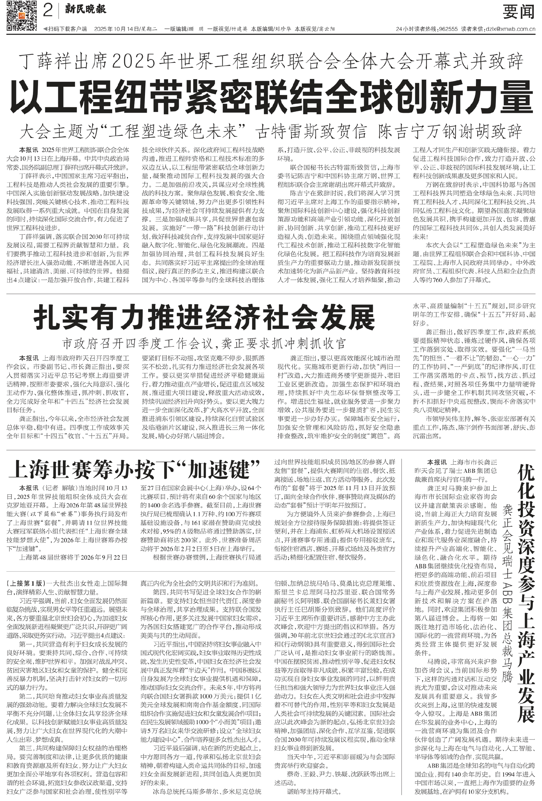 本报讯 2025年世界工程组织联合会全体大会10月13日在上海开幕。中共中央政治局常委、国务院副总理丁薛祥出席开幕式并致辞。