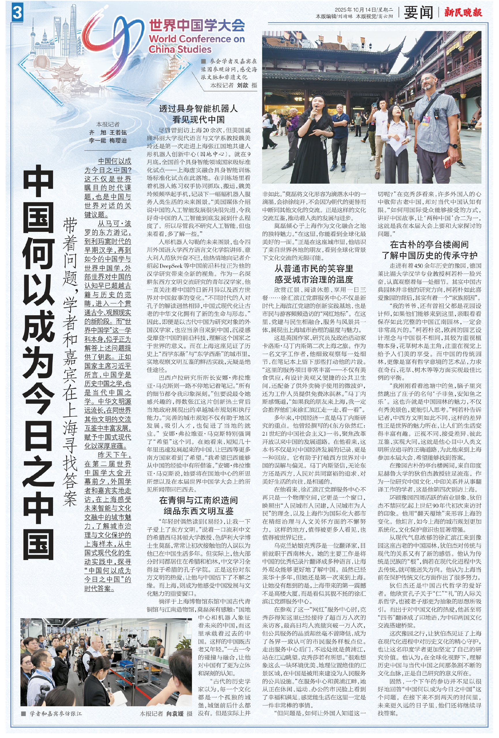 昨天下午,在第二届世界中国学大会开幕前夕,外国学者和嘉宾实地走访,在上海感受未来智能与文化交融中的城市魅力,了解城市治理与文化保护的上海样本,从中国式现代化的生动实践中,探寻“中国何以成为今日之中国”的时代答案。
