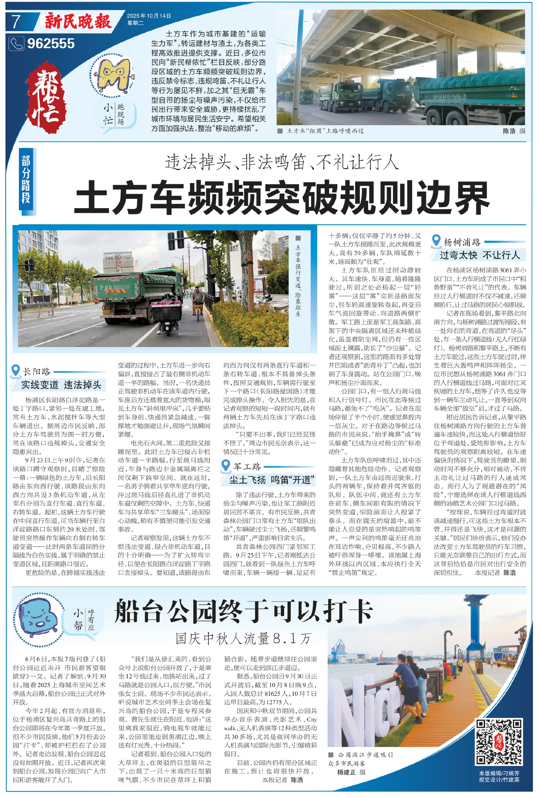 土方车作为城市基建的“运输生力军”,转运建材与渣土,为各类工程高效推进提供支撑。近日,多位市民向“新民帮侬忙”栏目反映,部分路段区域的土方车频频突破规则边界,违反禁令标志、违规鸣笛、不礼让行人等行为屡见不鲜,加之其“巨无霸”车型自带的扬尘与噪声污染,不仅给市民出行带来安全威胁,更持续扰乱了城市环境与居民生活安宁。希望相关方面加强执法,整治“移动的麻烦”。