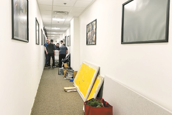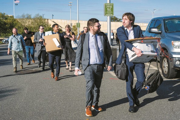 15日下午,记者们将纸箱、办公椅、家具、照片、地图、电脑、复印机等办公设备和个人物品运往停车场。在交回证件后,大约四五十名记者集体离开五角大楼。