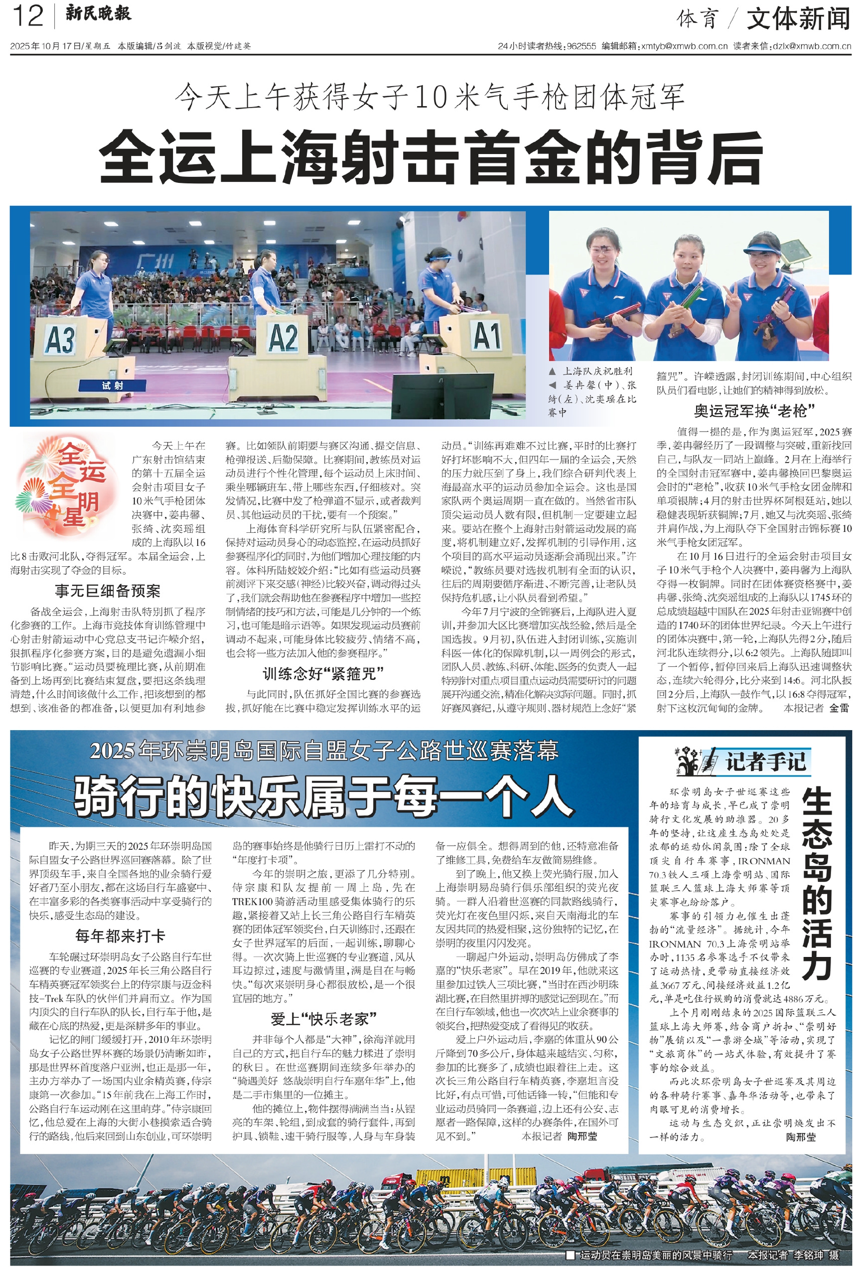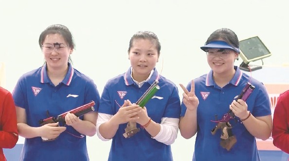 在10月16日进行的全运会射击项目女子10米气手枪个人决赛中,姜冉馨为上海队夺得一枚铜牌。同时在团体赛资格赛中,姜冉馨、张绮、沈奕瑶组成的上海队以1745环的总成绩超越中国队在2025年射击亚锦赛中创造的1740环的团体世界纪录。今天上午进行的团体决赛中,第一轮,上海队先得2分,随后河北队连续得分,以6:2领先。上海队随即叫了一个暂停,暂停回来后上海队迅速调整状态,连续六轮得分,比分来到14:6。河北队扳回2分后,上海队一鼓作气,以16:8夺得冠军,射下这枚沉甸甸的金牌。