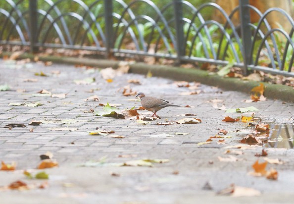 一夜风雨后,申城气温回落,各处的人行道上落叶缤纷,清晨的余姚路上,一只小斑鸠在满地落叶中踱步 本报记者 周馨 摄
