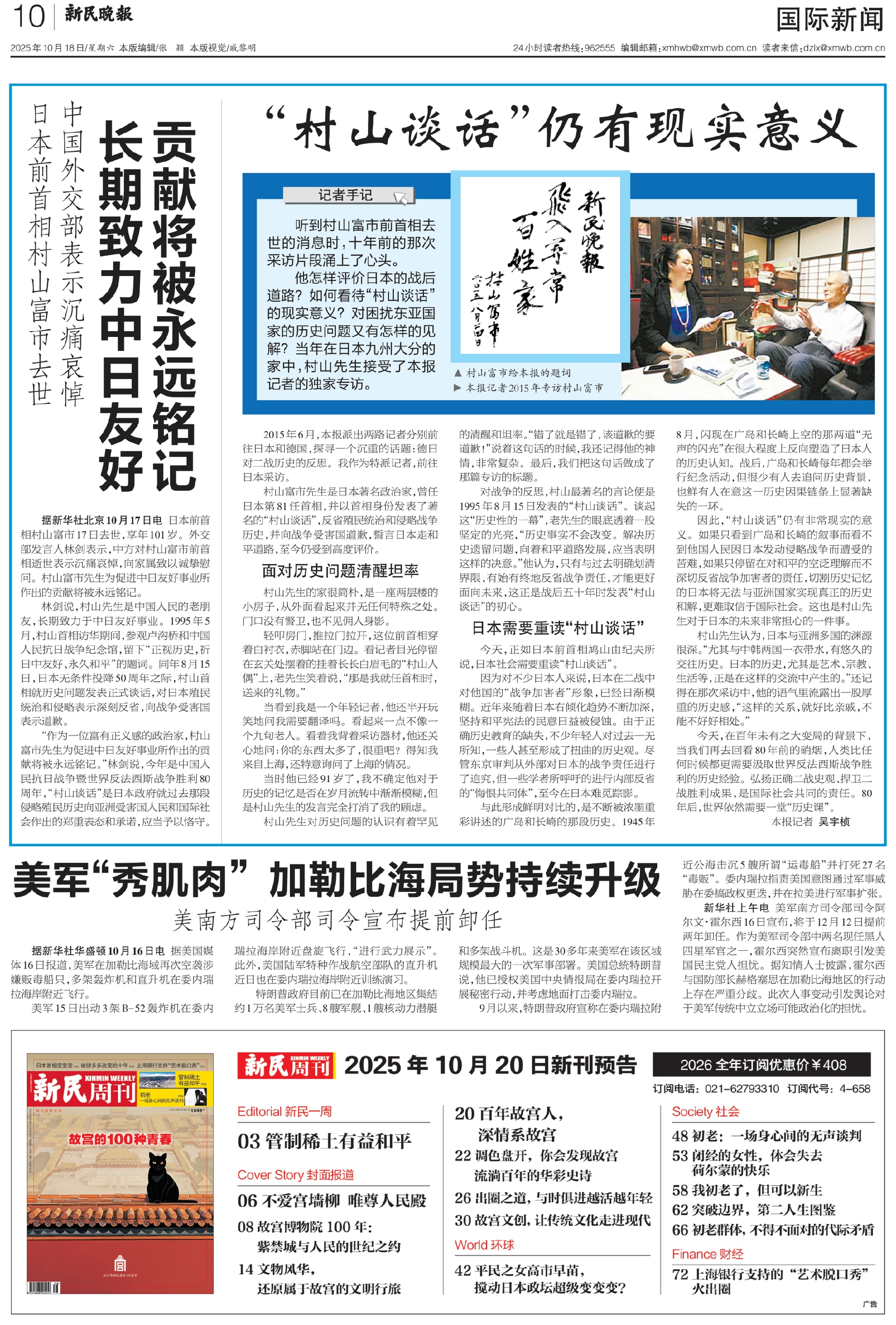 “作为一位富有正义感的政治家,村山富市先生为促进中日友好事业所作出的贡献将被永远铭记。”林剑说,今年是中国人民抗日战争暨世界反法西斯战争胜利80周年,“村山谈话”是日本政府就过去那段侵略殖民历史向亚洲受害国人民和国际社会作出的郑重表态和承诺,应当予以恪守。