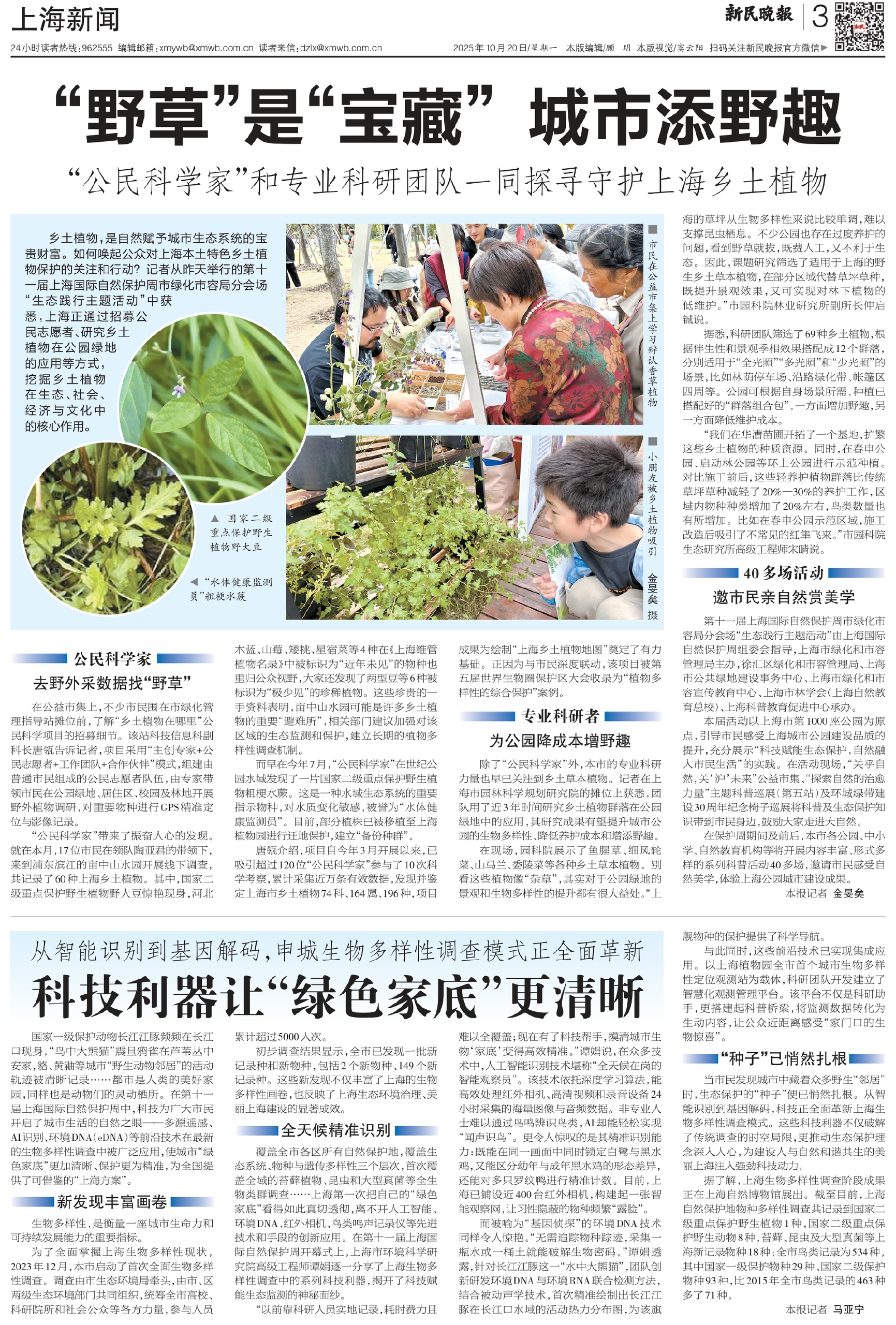 唐瓴介绍,项目自今年3月开展以来,已吸引超过120位“公民科学家”参与了10次科学考察,累计采集近万条有效数据,发现并鉴定上海市乡土植物74科、164属、196种,项目成果为绘制“上海乡土植物地图”奠定了有力基础。正因为与市民深度联动,该项目被第五届世界生物圈保护区大会收录为“植物多样性的综合保护”案例。