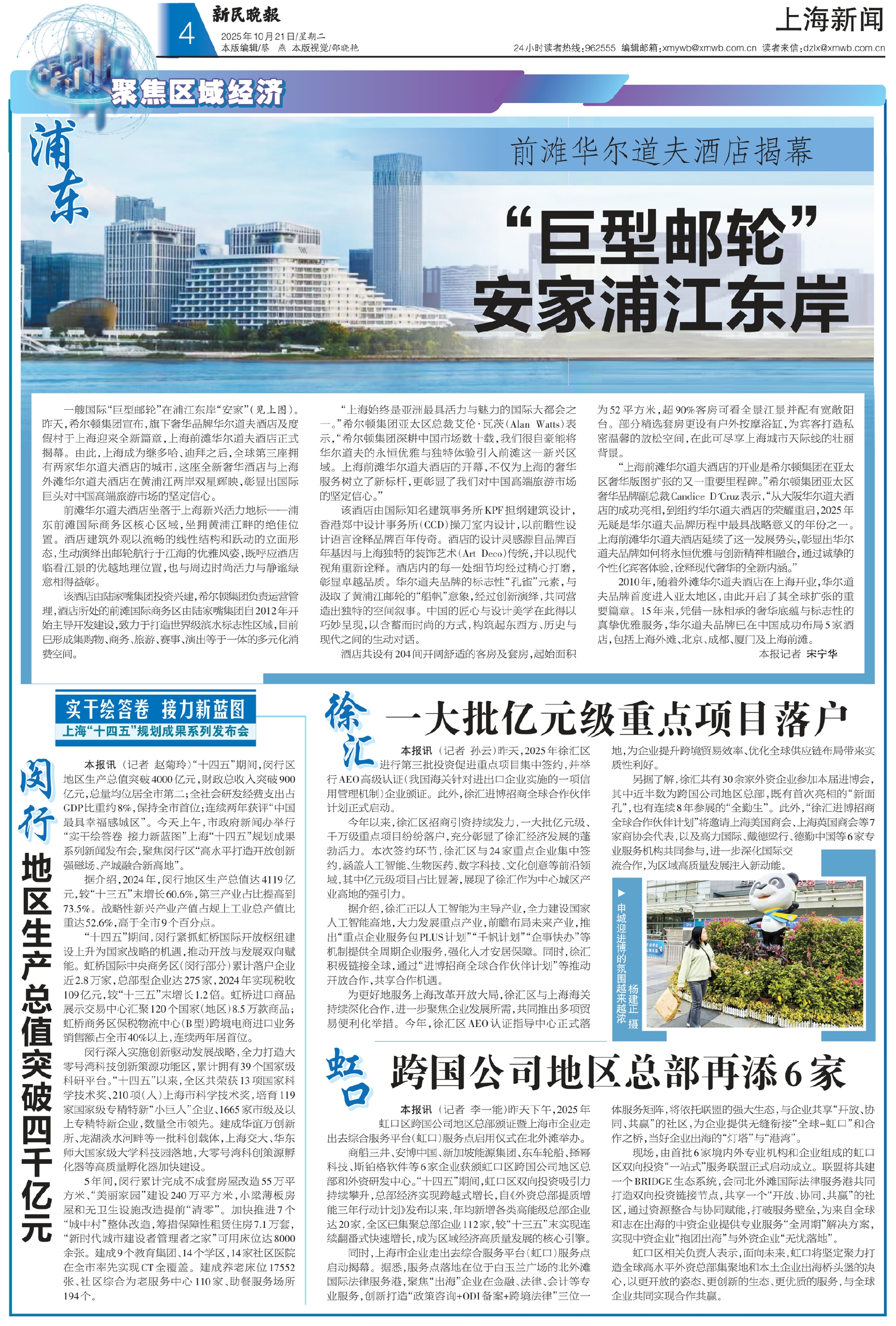 一艘国际“巨型邮轮”在浦江东岸“安家”(见上图)。昨天,希尔顿集团宣布,旗下奢华品牌华尔道夫酒店及度假村于上海迎来全新篇章,上海前滩华尔道夫酒店正式揭幕。由此,上海成为继多哈、迪拜之后,全球第三座拥有两家华尔道夫酒店的城市,这座全新奢华酒店与上海外滩华尔道夫酒店在黄浦江两岸双星辉映,彰显出国际巨头对中国高端旅游市场的坚定信心。