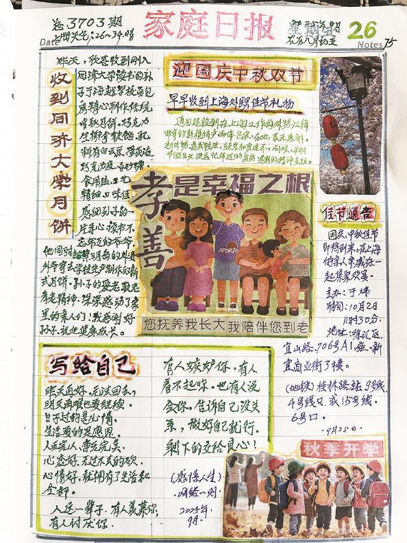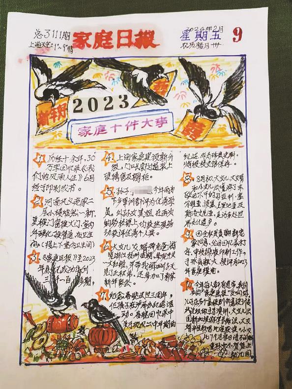 这天的日报是第3726期,主题是“亲情沟通”。头条是祝贺儿子于炜主编的国家首部《中国高端装备创新设计发展报告》正式出版发行。每天,他手写报纸要花2个小时。起初,他写字时手还会像很多老人一样,握笔就抖,慢慢地越写越顺,手也不抖了。文章手写完毕,他还会手绘插图,美化版面,让这份《家庭日报》图文并茂,既起到信息传递的作用,也带给家人美的感受。