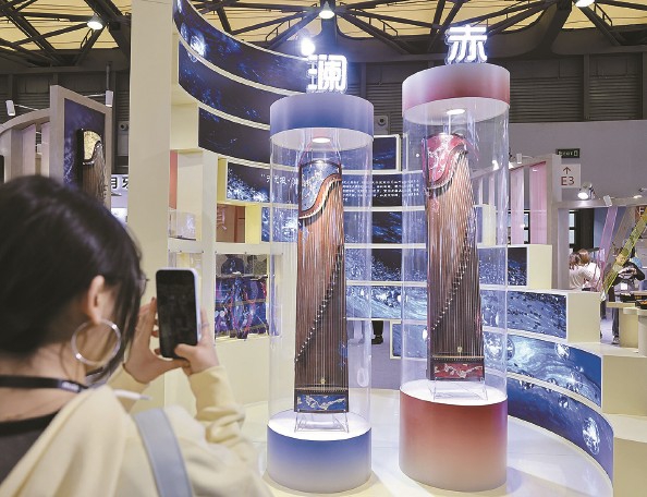观众在价值百万元的“无垠”系列古筝前留影 本报记者 王凯 摄
