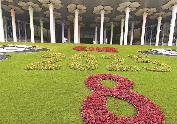 国家会展中心(上海)南广场的绿化布置已基本完成,静待盛会揭幕 本报记者 刘歆 摄
