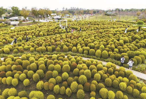 申城“一夜入秋”,金山区朱泾镇花开海上生态园秋意渐浓。园内格桑花花海在微风中漾起柔粉与纯白的波浪,地肤植株边缘悄然晕开一抹羞涩的绯红,醉蝶花颤动着粉紫色花穗,与百日草等编织出秋日限定浪漫。 本报记者 陶磊 摄影报道