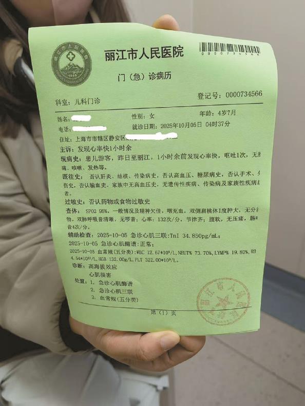 10月4日当天,陈先生一家顺利抵达丽江,简单游玩用过晚餐后回到酒店休息,没想到凌晨4时许,4岁多的女儿出现不适反应。“心率很快,还伴随呕吐,人非常难受。”见此情况,陈先生夫妇急忙连夜将女儿送到丽江市人民医院。经过一系列检查后,女儿被诊断为“高海拔效应”,立即进行了吸氧治疗。
