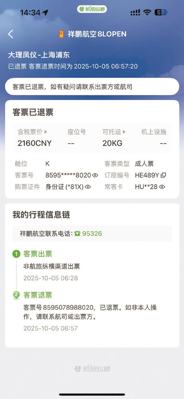 陈先生表示,当天情况紧急,为了带女儿尽快返沪,他只能先办理退票,又再次下单购买了3张从丽江回上海的机票,后续的云南游行程也全部取消。在陈先生提供的订票和付款记录上,记者看到10月5日6:26,陈先生支付5824元预订了3张祥鹏航空8L9791航班的机票。6:37,女儿的机票成功免费退票。两张成人票出票,申请退票后8:35退回2230元机票款,被扣2090元退票手续费。