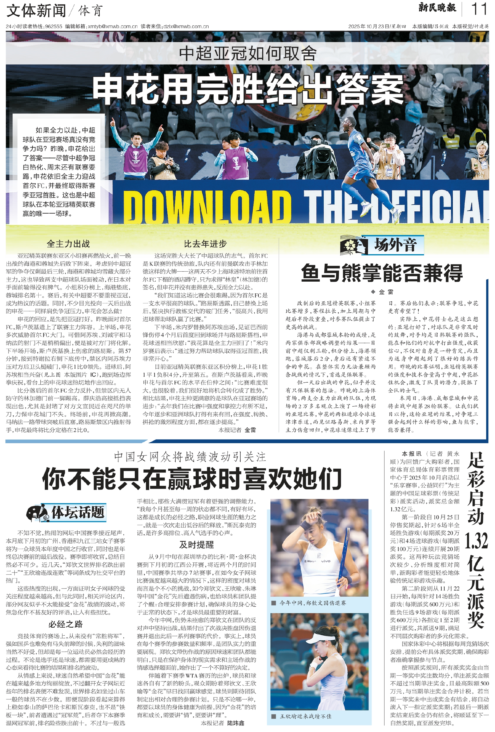 目前亚冠精英联赛东亚区积分榜上,申花1胜1平1负积4分,升至第五。在斯卢茨基看来,昨晚申花与首尔FC的水平在伯仲之间:“比赛难度很大,也很胶着,我们很好地将机会转化成了胜势。”相比结果,申花主帅更满意的是球队在亚冠赛场的进步:“去年我们在比赛中强度和掌控力有所不足,今年逐步和亚洲球队打得有来有回,在强度、转换、拼抢的激烈程度方面,都在逐步提高。”