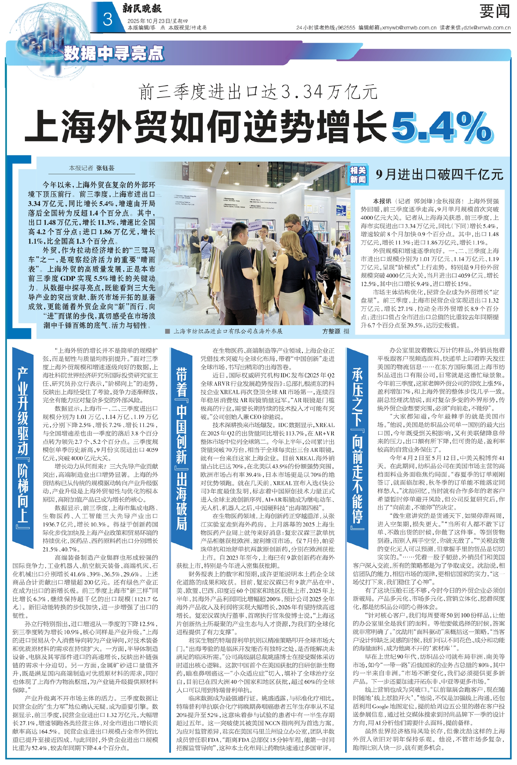 外贸,作为拉动经济增长的“三驾马车”之一,是观察经济活力的重要“晴雨表”。上海外贸的高质量发展,正是本市前三季度GDP实现5.5%增长的关键动力。从数据中探寻亮点,既能看到三大先导产业的突出贡献、新兴市场开拓的显著成效,更能循着外贸企业向“新”而行、向“进”而谋的步伐,真切感受在市场浪潮中千锤百炼的底气、活力与韧性。
