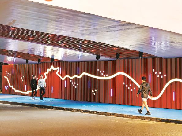 南苏州路、恒丰路桥下空间近日经改造变身光影艺术长廊。桥下立体装饰面、阶梯侧面造型灯、步道投影灯光,将“蝴蝶”主题元素巧妙融入空间。处处都是“蝴蝶”的影子,就连两侧绿地里也增加了蝴蝶造型的LED灯。夜幕降临,桥下空间变换出多彩灯光,市民从这里经过,仿佛穿越光影隧道,驻足流连。 本报记者 刘歆 摄影报道