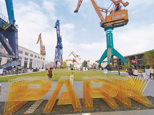 随着复兴岛船台公园的开放,工业遗存与艺术交织吸引众多市民与游客前来“打卡”,更促进了消费升级与产业融合。耸立的吊机成为船台公园的新景观符号,也唤醒了复兴岛的工业基因。 本报记者 刘歆 摄影报道