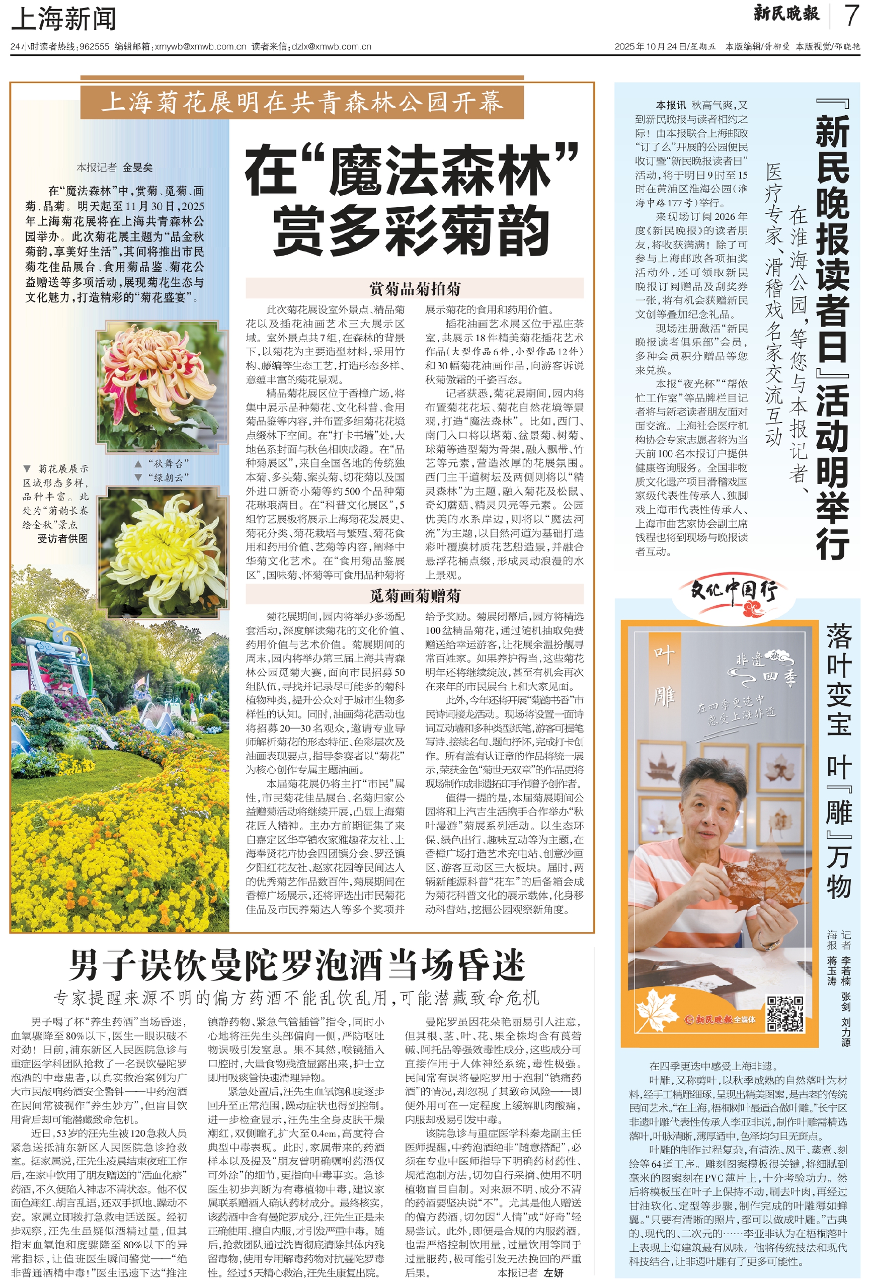 在“魔法森林”中,赏菊、觅菊、画菊、品菊。明天起至11月30日,2025年上海菊花展将在上海共青森林公园举办。此次菊花展主题为“品金秋菊韵,享美好生活”,其间将推出市民菊花佳品展台、食用菊品鉴、菊花公益赠送等多项活动,展现菊花生态与文化魅力,打造精彩的“菊花盛宴”。