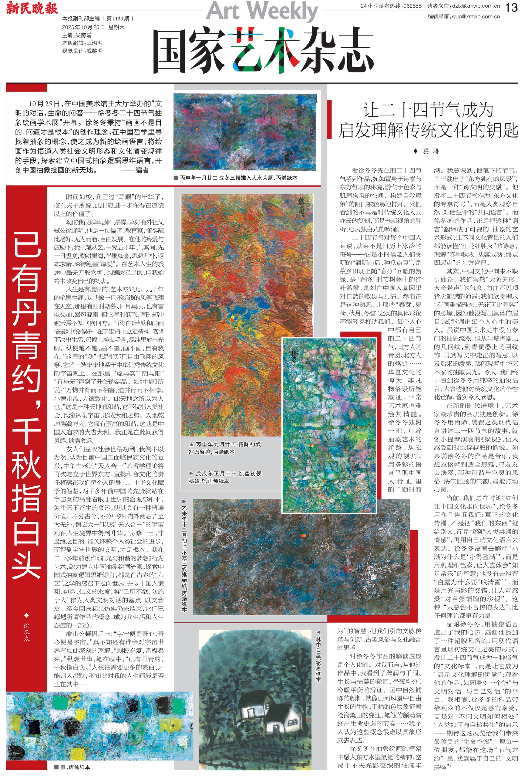 10月25日,在中国美术馆主大厅举办的“文明的对话,生命的问答——徐冬冬二十四节气抽象绘画学术展”开幕。徐冬冬秉持“画画不是目的,问道才是根本”的创作理念,在中国哲学里寻找着抽象的概念,使之成为新的绘画语言,将绘画作为悟道人类社会文明形态和文化演变规律的手段,探索建立中国式抽象逻辑思维语言,开创中国抽象绘画的新天地。 ——编者