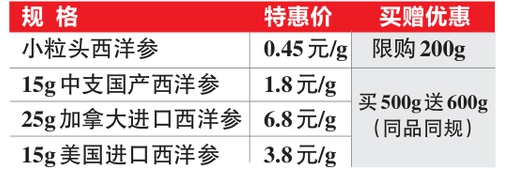 西洋参是传统滋补上品,近期申城天气渐凉,一杯暖暖的西洋参泡茶,会给整个身体带来健康,不犯困,不上火,更能使您充满活力感。我们的西洋参,是产地直供,“11·11”特卖节期间,价格公道,一定要去南京西路555号二楼看一看。
