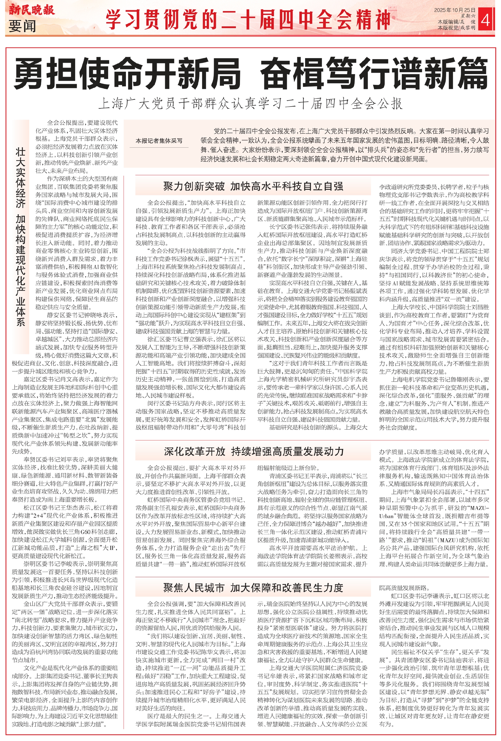 党的二十届四中全会公报发布,在上海广大党员干部群众中引发热烈反响。大家在第一时间认真学习领会全会精神,一致认为,全会公报系统擘画了未来五年国家发展的宏伟蓝图,目标明确、路径清晰,令人鼓舞、催人奋进。大家纷纷表示,要深刻领会全会公报精神,以“排头兵”的姿态和“先行者”的担当,努力续写经济快速发展和社会长期稳定两大奇迹新篇章,奋力开创中国式现代化建设新局面。