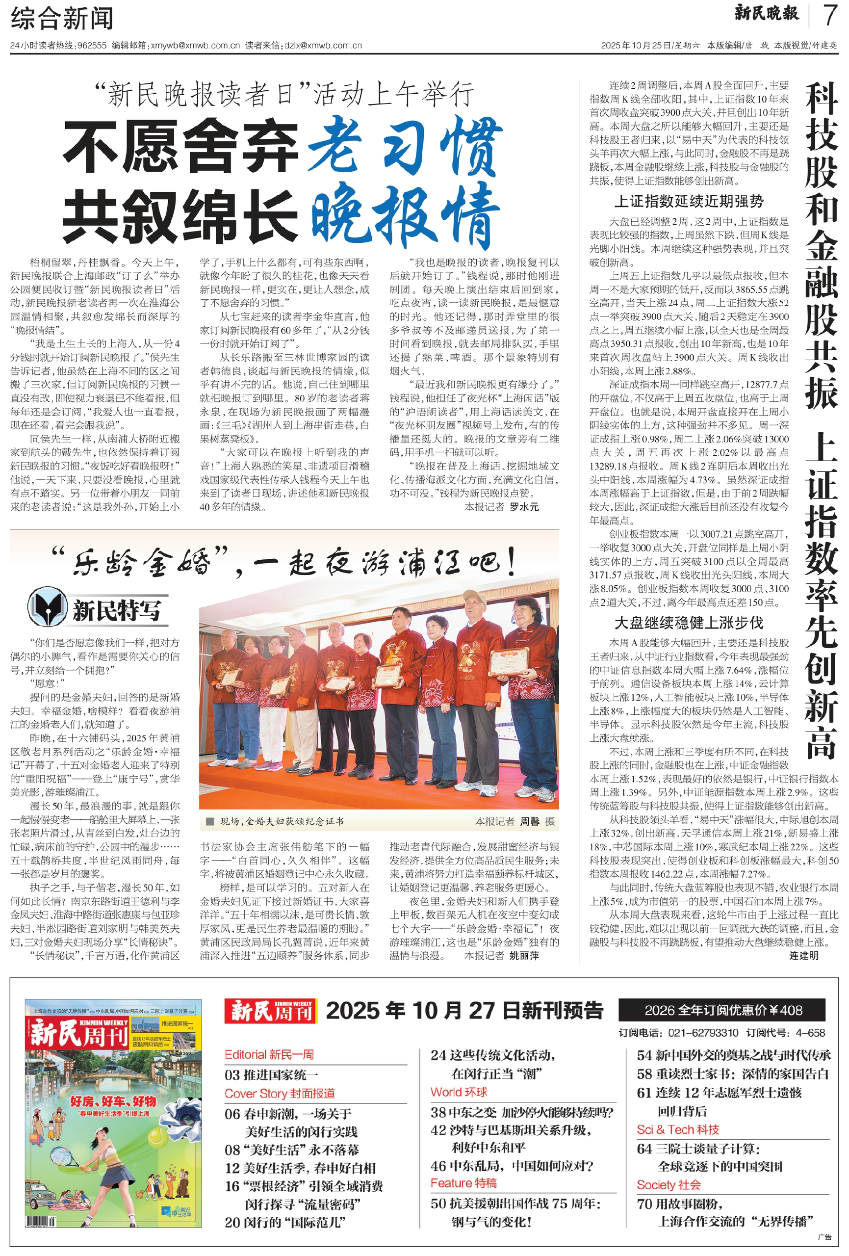 同侯先生一样,从南浦大桥附近搬家到航头的戴先生,也依然保持着订阅新民晚报的习惯。“夜饭吃好看晚报呀!”他说,一天下来,只要没看晚报,心里就有点不踏实。另一位带着小朋友一同前来的老读者说:“这是我外孙,开始上小学了,手机上什么都有,可有些东西啊,就像今年盼了很久的桂花,也像天天看新民晚报一样,更实在,更让人想念,成了不愿舍弃的习惯。”