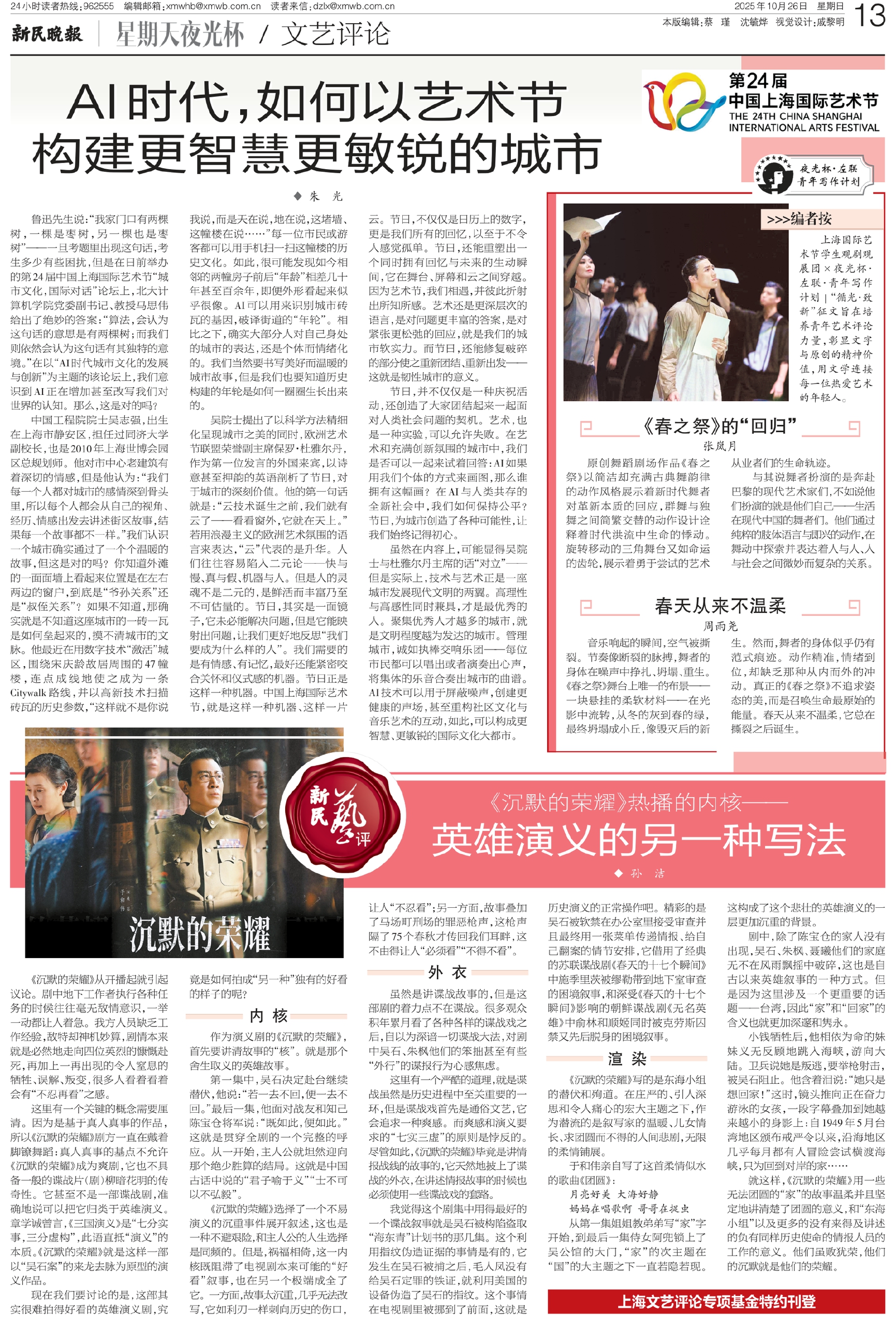 吴院士提出了以科学方法精细化呈现城市之美的同时,欧洲艺术节联盟荣誉副主席保罗·杜雅尔丹,作为第一位发言的外国来宾,以诗意甚至押韵的英语剖析了节日,对于城市的深刻价值。他的第一句话就是:“云技术诞生之前,我们就有云了——看看窗外,它就在天上。”若用浪漫主义的欧洲艺术氛围的语言来表达,“云”代表的是升华。人们往往容易陷入二元论——快与慢、真与假、机器与人。但是人的灵魂不是二元的,是鲜活而丰富乃至不可估量的。节日,其实是一面镜子,它未必能解决问题,但是它能映射出问题,让我们更好地反思“我们要成为什么样的人”。我们需要的是有情感、有记忆,最好还能紧密咬合关怀和仪式感的机器。节日正是这样一种机器。中国上海国际艺术节,就是这样一种机器、这样一片云。节日,不仅仅是日历上的数字,更是我们所有的回忆,以至于不令人感觉孤单。节日,还能重塑出一个同时拥有回忆与未来的生动瞬间,它在舞台、屏幕和云之间穿越。因为艺术节,我们相遇,并彼此折射出所知所感。艺术还是更深层次的语言,是对问题更丰富的答案,是对紧张更松弛的回应,就是我们的城市软实力。而节日,还能修复破碎的部分使之重新团结、重新出发——这就是韧性城市的意义。