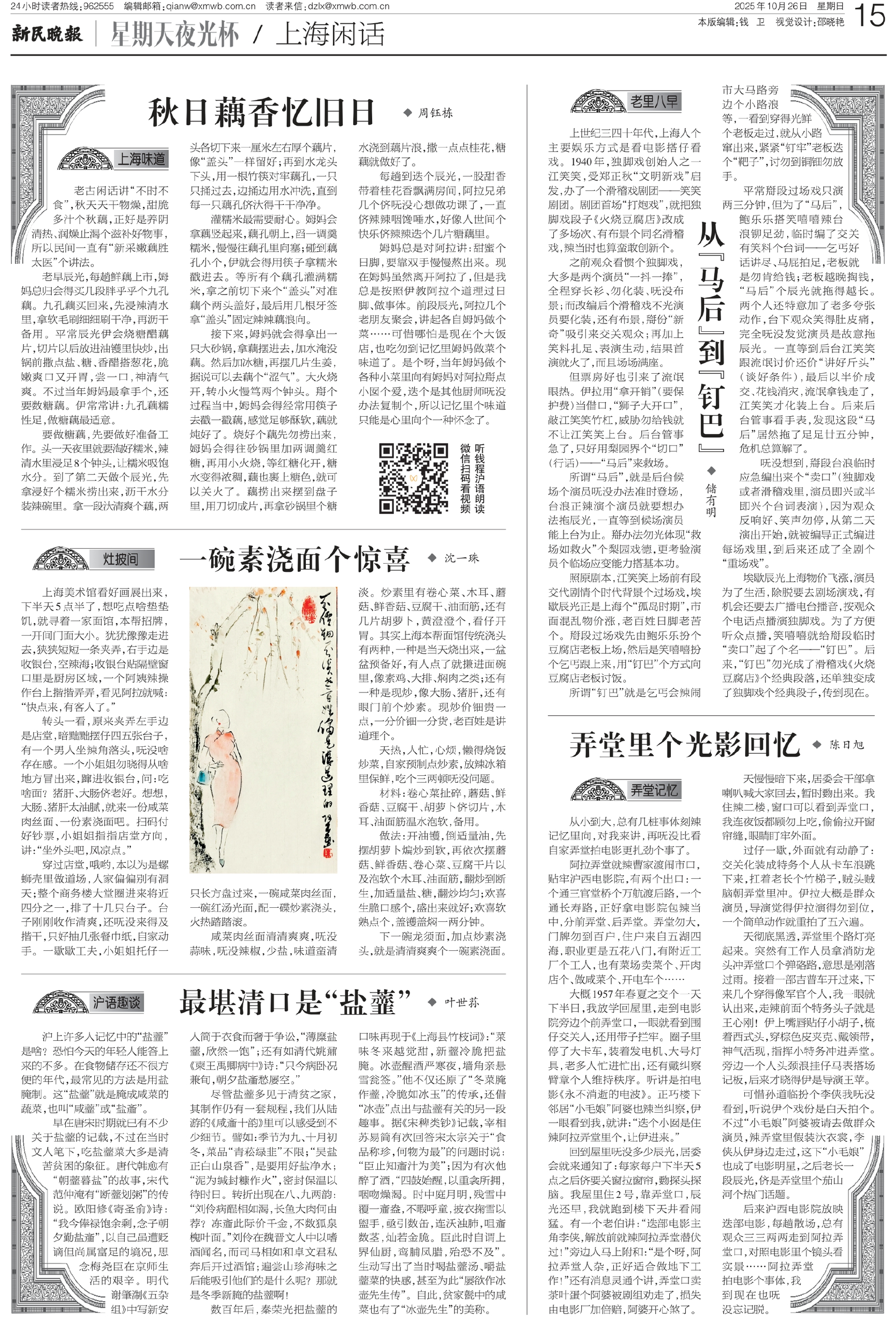 姆妈总是对阿拉讲:甜蜜个日脚,要靠双手慢慢熬出来。现在姆妈虽然离开阿拉了,但是我总是按照伊教阿拉个道理过日脚、做事体。前段辰光,阿拉几个老朋友聚会,讲起各自姆妈做个菜……可惜哪怕是现在个大饭店,也吃勿到记忆里姆妈做菜个味道了。是个呀,当年姆妈做个各种小菜里向有姆妈对阿拉搿点小囡个爱,迭个是其他厨师呒没办法复制个,所以记忆里个味道只能是心里向个一种怀念了。