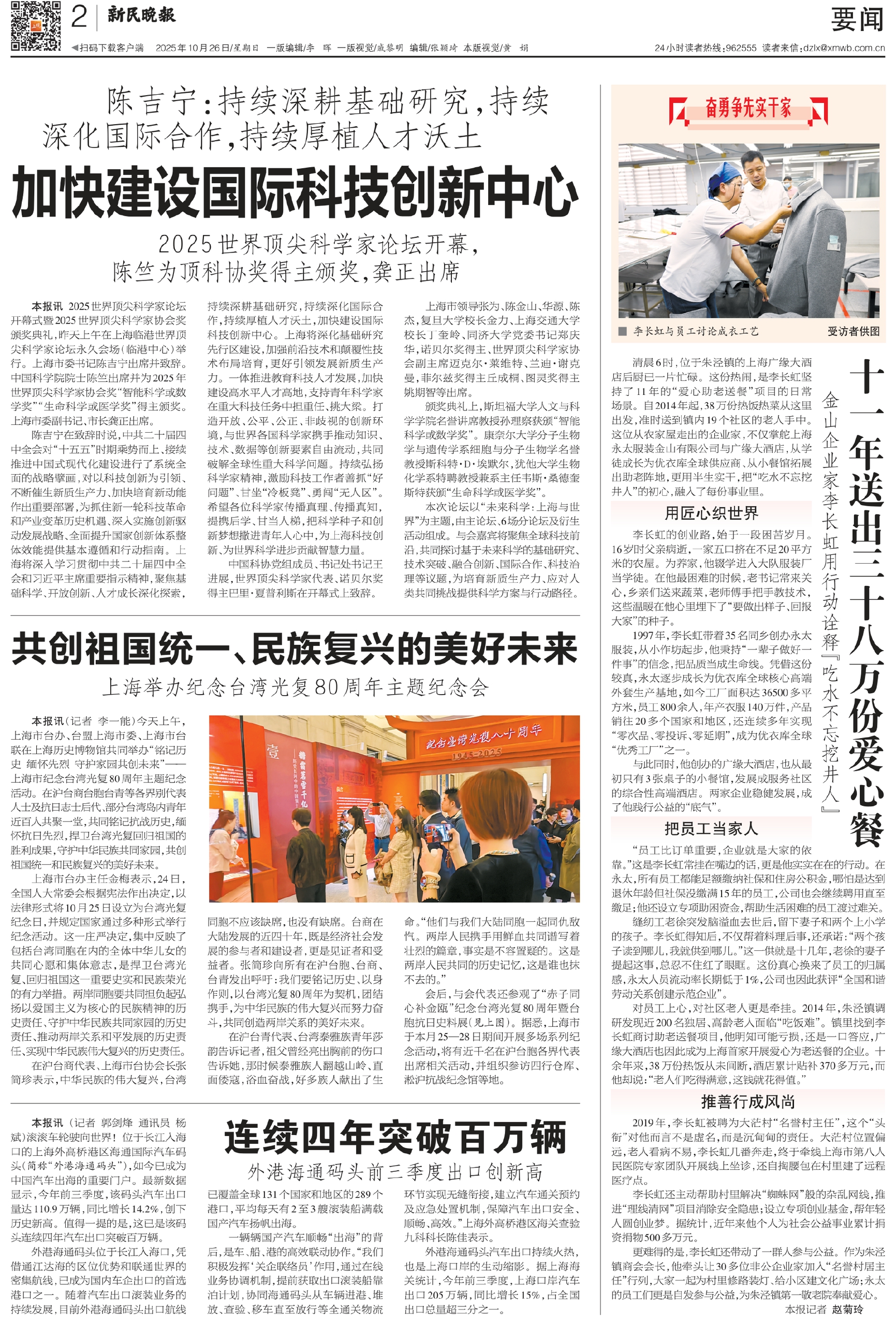 陈吉宁在致辞时说,中共二十届四中全会对“十五五”时期乘势而上、接续推进中国式现代化建设进行了系统全面的战略擘画,对以科技创新为引领、不断催生新质生产力、加快培育新动能作出重要部署,为抓住新一轮科技革命和产业变革历史机遇、深入实施创新驱动发展战略、全面提升国家创新体系整体效能提供基本遵循和行动指南。上海将深入学习贯彻中共二十届四中全会和习近平主席重要指示精神,聚焦基础科学、开放创新、人才成长深化探索,持续深耕基础研究,持续深化国际合作,持续厚植人才沃土,加快建设国际科技创新中心。上海将深化基础研究先行区建设,加强前沿技术和颠覆性技术布局培育,更好引领发展新质生产力。一体推进教育科技人才发展,加快建设高水平人才高地,支持青年科学家在重大科技任务中担重任、挑大梁。打造开放、公平、公正、非歧视的创新环境,与世界各国科学家携手推动知识、技术、数据等创新要素自由流动,共同破解全球性重大科学问题。持续弘扬科学家精神,激励科技工作者善抓“好问题”、甘坐“冷板凳”、勇闯“无人区”。希望各位科学家传播真理、传播真知,提携后学、甘当人梯,把科学种子和创新梦想撒进青年人心中,为上海科技创新、为世界科学进步贡献智慧力量。