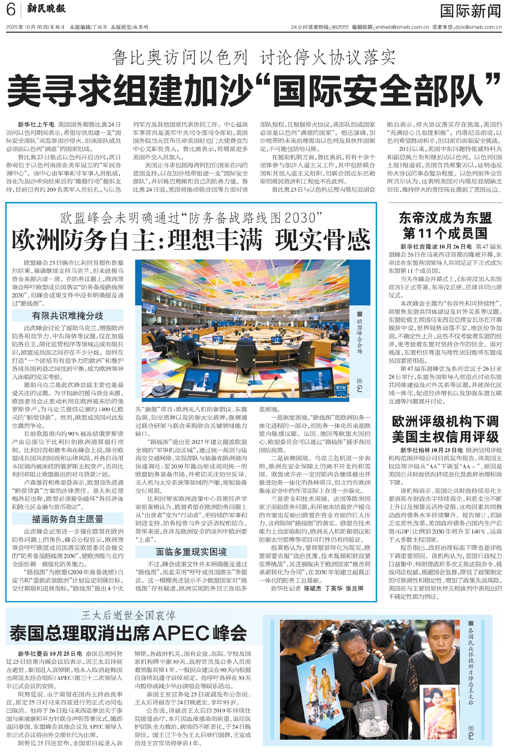 美国正寻求包括海湾阿拉伯国家在内的盟国支持,以在加沙地带组建一支“国际安全部队”,并训练巴勒斯坦自己的防务力量。鲁比奥24日说,美国将推动联合国等方面对该部队授权,且根据停火协议,该部队组成国家必须是以色列“满意的国家”。他还强调,加沙地带的未来治理需由以色列及其伙伴国制定,不可能包括哈马斯。