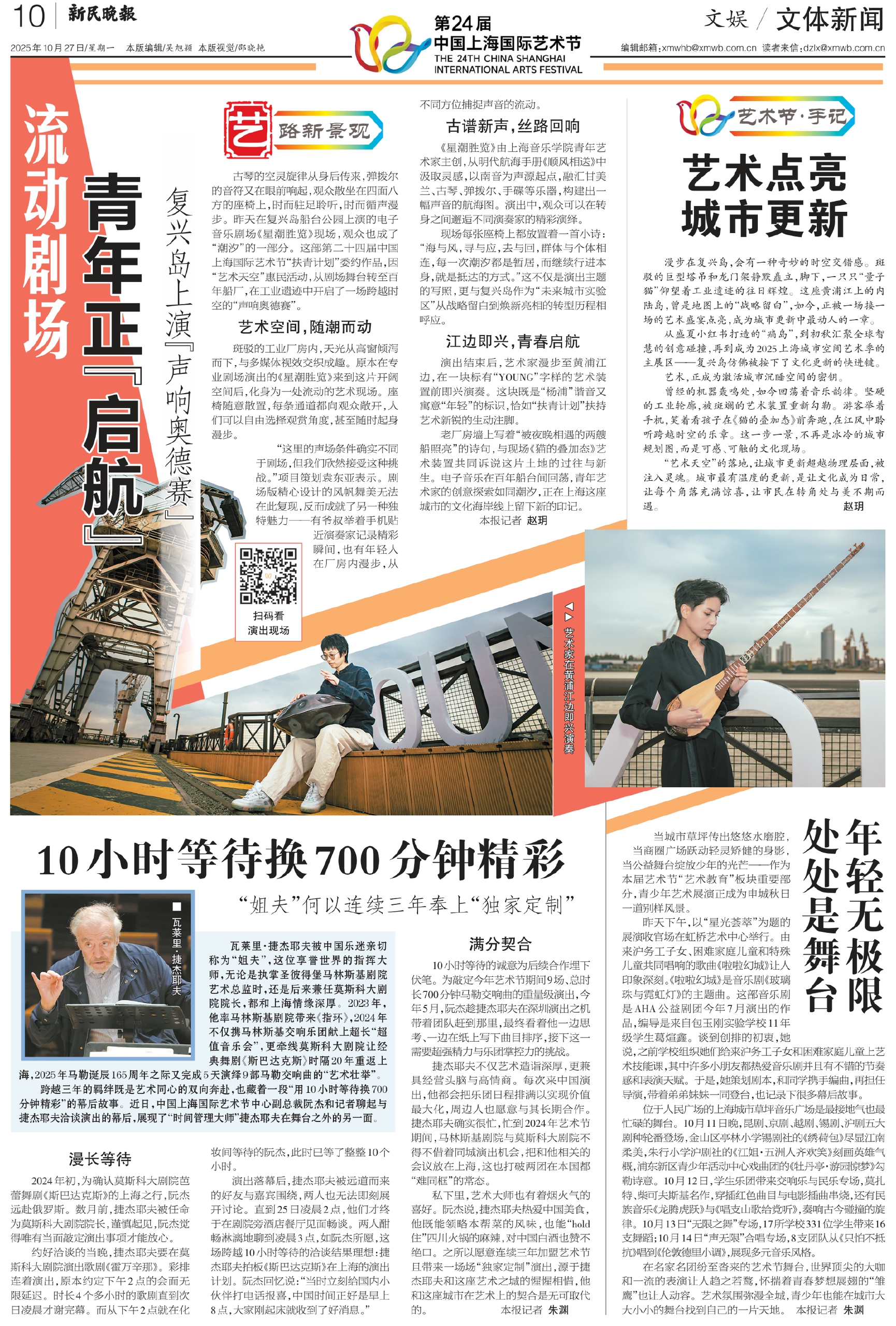 演出结束后,艺术家漫步至黄浦江边,在一块标有“YOUNG”字样的艺术装置前即兴演奏。这块既是“杨浦”谐音又寓意“年轻”的标识,恰如“扶青计划”扶持艺术新锐的生动注脚。