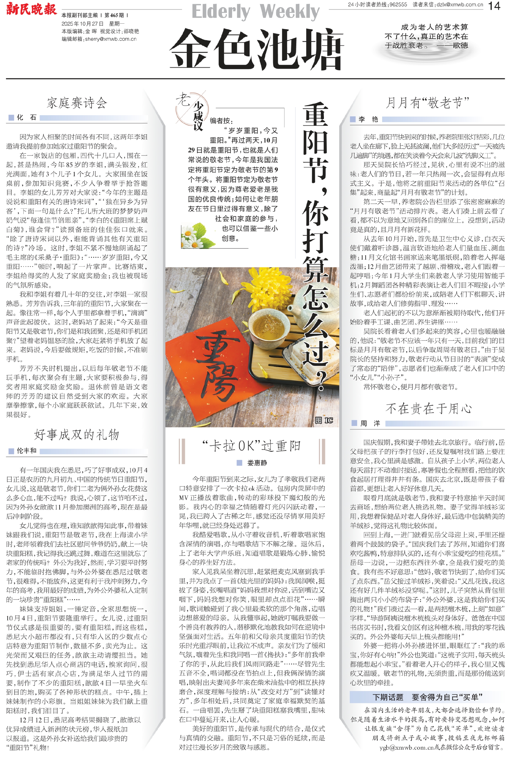 芳芳不失时机提出,以后每年敬老节不能玩手机,每次聚会有主题,大家要积极参与,得奖者用家庭奖励金奖励。退休前曾是语文老师的芳芳的建议自然受到大家的欢迎。大家摩拳擦掌,每个小家庭跃跃欲试。几年下来,效果很好。