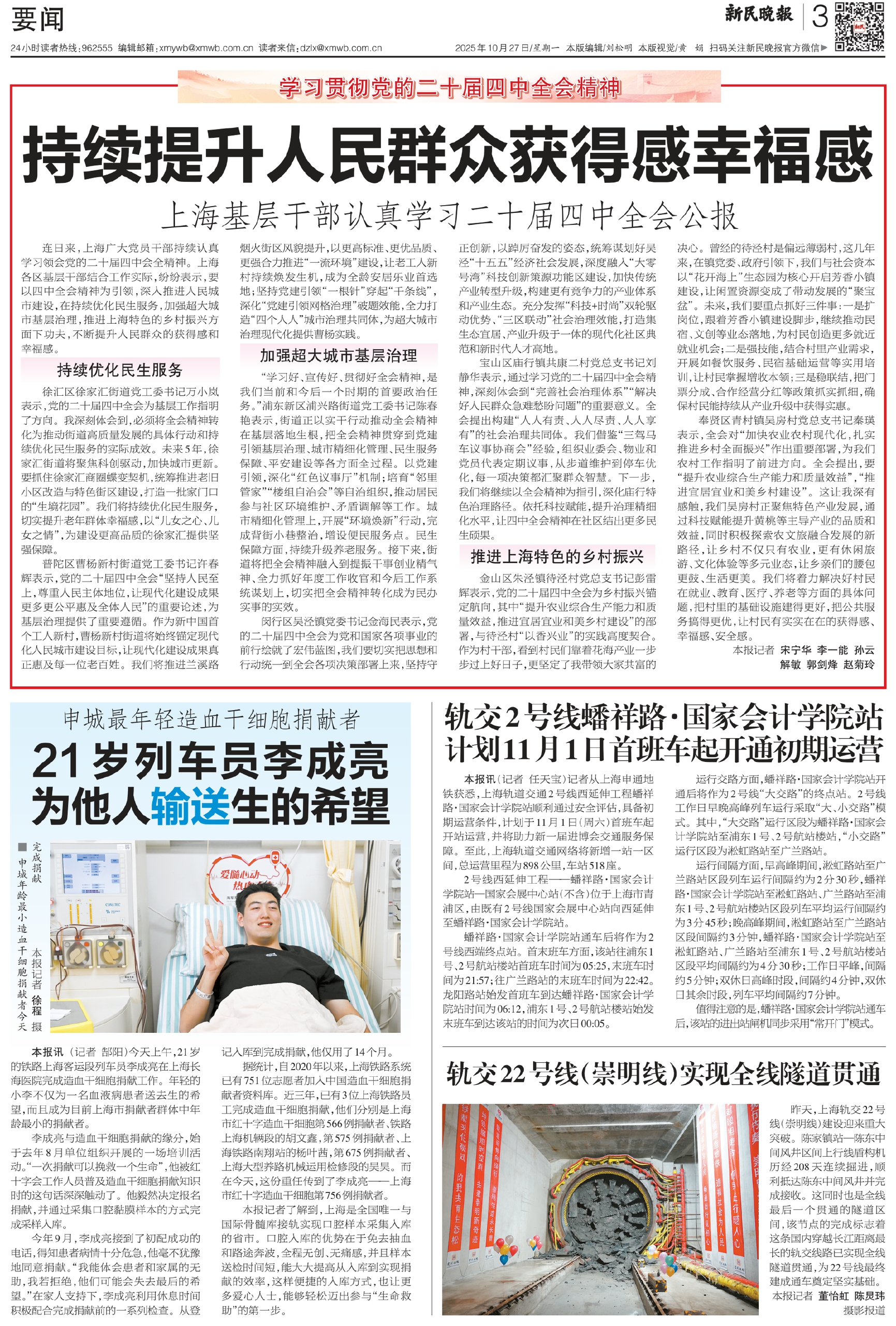 连日来,上海广大党员干部持续认真学习领会党的二十届四中会全精神。上海各区基层干部结合工作实际,纷纷表示,要以四中全会精神为引领,深入推进人民城市建设,在持续优化民生服务,加强超大城市基层治理,推进上海特色的乡村振兴方面下功夫,不断提升人民群众的获得感和幸福感。