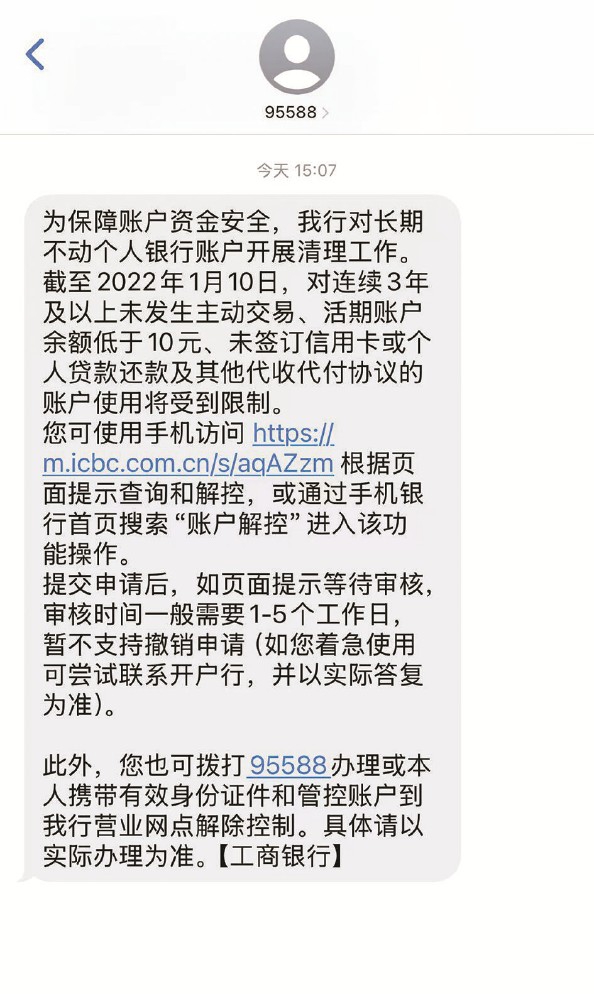 “为保障账户资金安全,我行对长期不动个人银行账户开展清理工作。截至2022年1月10日,对连续3年及以上未发生主动交易、活期账户余额低于10元、未签订信用卡或个人贷款还款及其他代收代付协议的账户限制使用。”工商银行的工作人员告诉记者,工行对长期不动户会暂停部分功能使用,并非直接销户,如果客户要恢复相关功能需在线上或到柜台进行账户解控。
