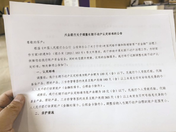 兴业银行的调整,则呈现出银行业在清理标准方面精细化、差异化的新特征。在嘉定区和静路新源路路口一个网点,记者刚进大堂就看到信息栏里张贴的“兴业银行关于调整长期不动户认定标准的公告”,发现调整后被银行纳入长期不动户治理的账户范围更小了——认定标准是账户余额为10元(含)以下,无该行个人贷款还款、代销基金产品、理财产品、三方存管等签约关系且账户连续365天(含)以上未发生任何非结息交易的个人人民币银行结算账户(金融社保卡、公积金卡除外)。