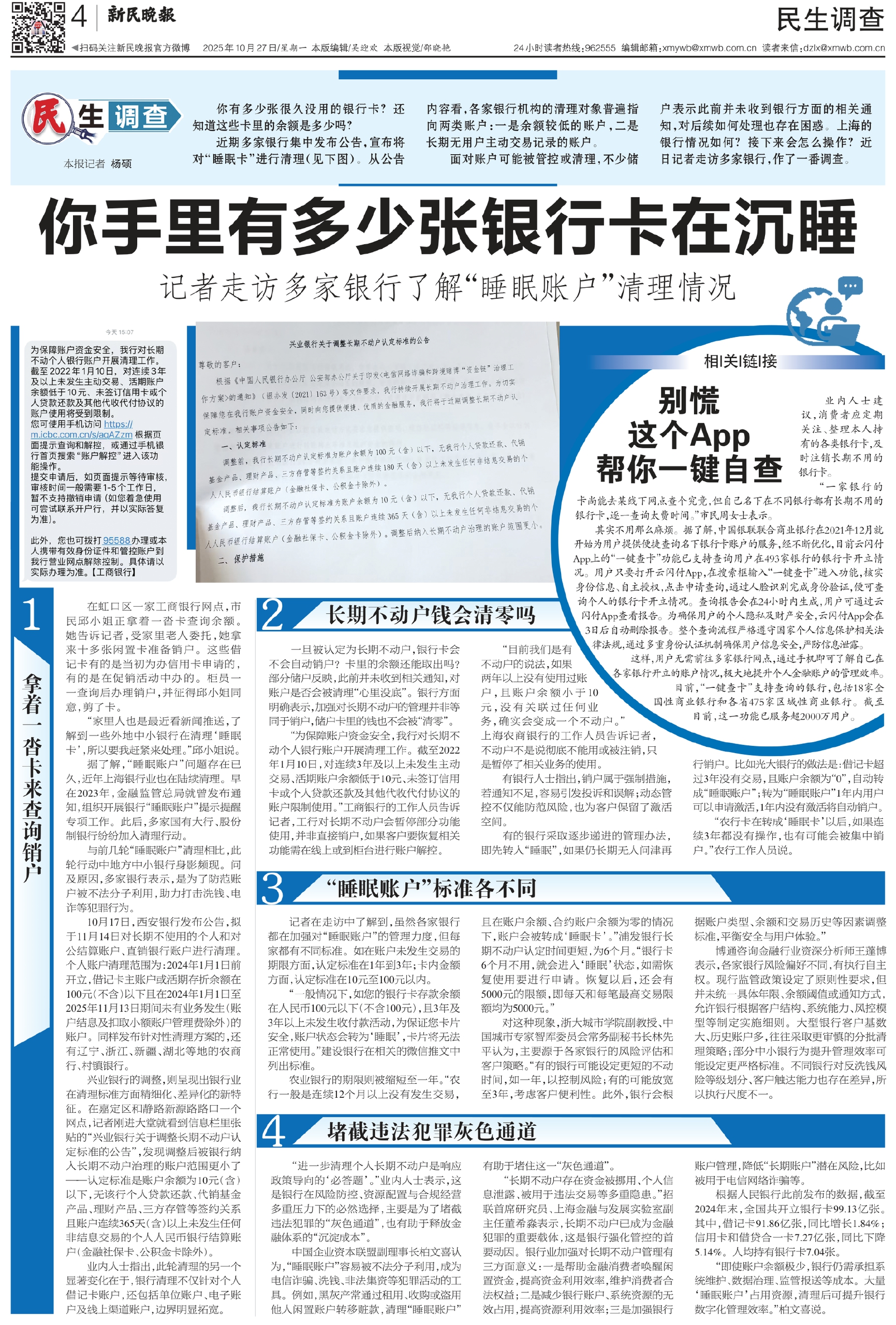 据了解,“睡眠账户”问题存在已久,近年上海银行业也在陆续清理。早在2023年,金融监管总局就曾发布通知,组织开展银行“睡眠账户”提示提醒专项工作。此后,多家国有大行、股份制银行纷纷加入清理行动。