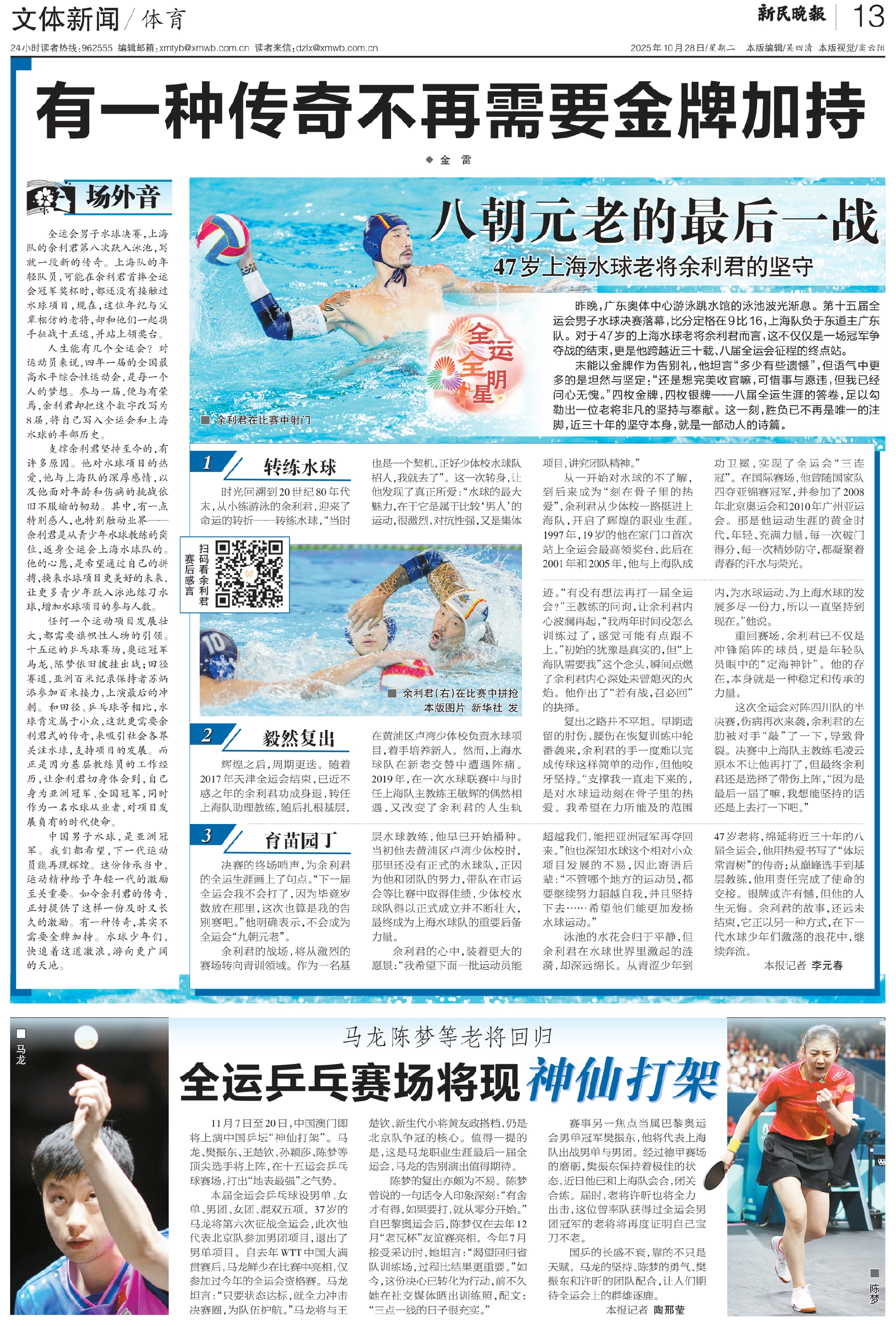 全运会男子水球决赛,上海队的余利君第八次跃入泳池,写就一段新的传奇。上海队的年轻队员,可能在余利君首捧全运会冠军奖杯时,都还没有接触过水球项目,现在,这位年纪与父辈相仿的老将,却和他们一起携手征战十五运,并站上领奖台。