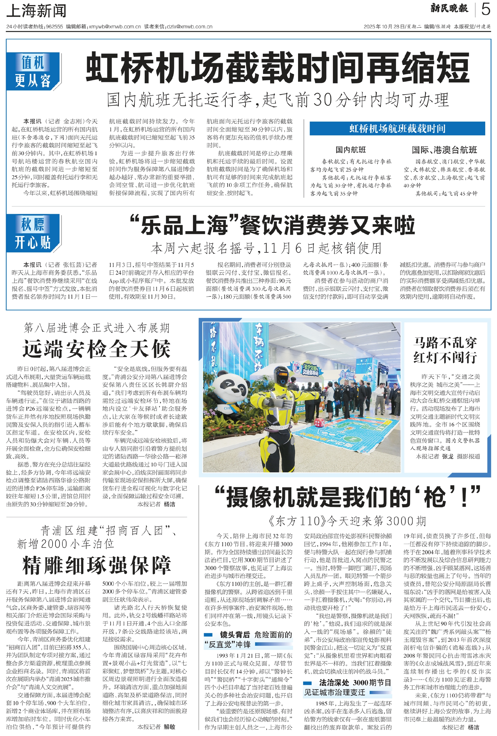 为进一步提升旅客出行体验,虹桥机场将进一步缩短截载时间作为服务保障第八届进博会越办越好、常办常新的重要举措,会同空管、航司进一步优化航班衔接保障流程,实现了国内所有航班面向无托运行李旅客的截载时间全面缩短至30分钟以内,旅客将有更加充裕的值机手续办理时间。